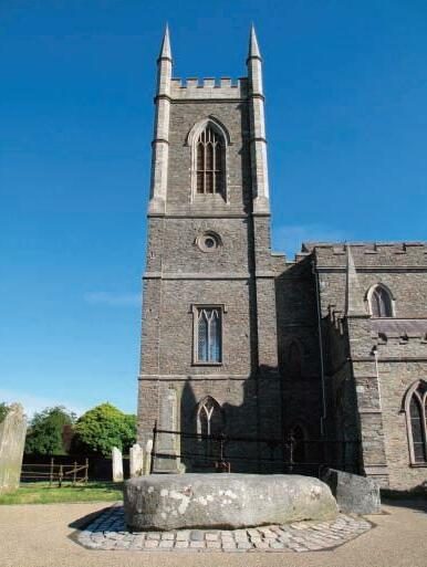 Down Cathedral with St Patrick’s Grave in the foreground, marked by a massive granite boulder placed there in 1900. Katedra w Down z grobem Świętego Patryka, oznaczonym przez masywny granitowy głaz usytuowany tam w 1900 roku.