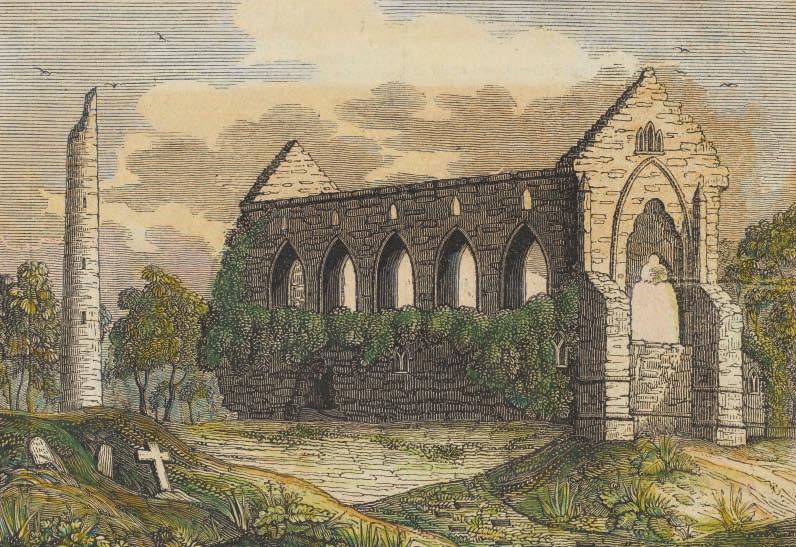A stone church probably stood here from the 10th century, to be replaced by a much larger cruciform (cross-shaped) church by the mid-12th century. After John de Courcy’s capture of Downpatrick in 1177, he set about creating an even larger Benedictine abbey, dedicated to St Patrick. The miraculous discovery of the bones of St Patrick in the graveyard in 1185, along with those of St Brigit and St Columba, led to their removal and enshrinement in the abbey church in June 1202.
