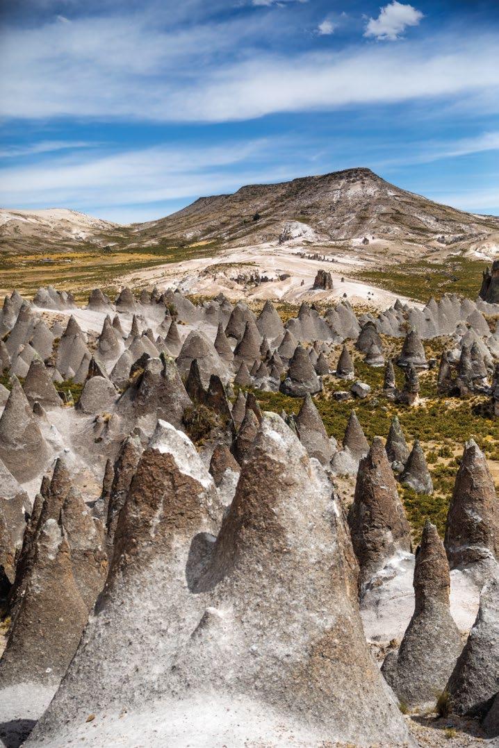Wind and the passage of time have sculpted the rocks of volcanic material into the Pampachiri Stone Forest. Some have pyramidal shapes and others show mushroom-like silhouettes, reaching 26 ft (8 m) in height. Their porous surfaces contain minerals, such as quartz, obsidian, and basalt.