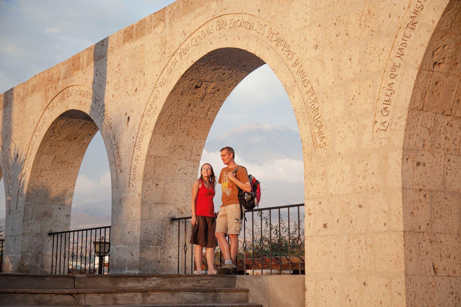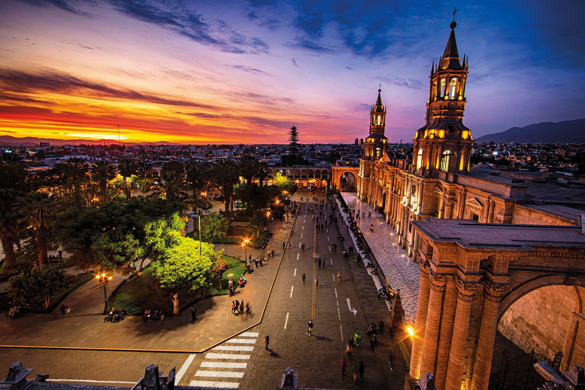 The neoclassical Republican architectural ensemble of the main square consists of the cathedral and arches built in granite, lime, and ashlar. In the center of the square, there is a bronze fountain with the “Tuturutu,” an emblematic figure which represents a 16th-century soldier in charge of delivering the royal messages. The scene is completed by the presence of the Misti and Chachani volcanoes.