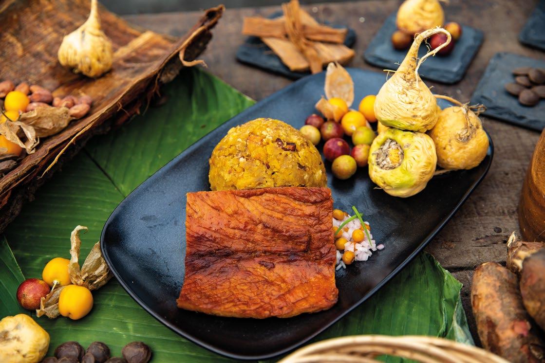 In addition to the popular juane, tacacho, and cecina, the cuisine of Loreto presents creations that are nourished by its abundant nature, such as the chonta salad (based on the stem of the palm tree), ceviche de dorado freshwater fish) and patarashca (fish wrapped in bijao leaves). The exotic fruits of the area are used to prepare soft drinks, such as aguajina aguaje) and chapo (made from ripe bananas). There are also masato and fermented cassava) and shibe (made with farina, fermented and toasted cassava). Among its spirits, the best known are the Siete Raíces and