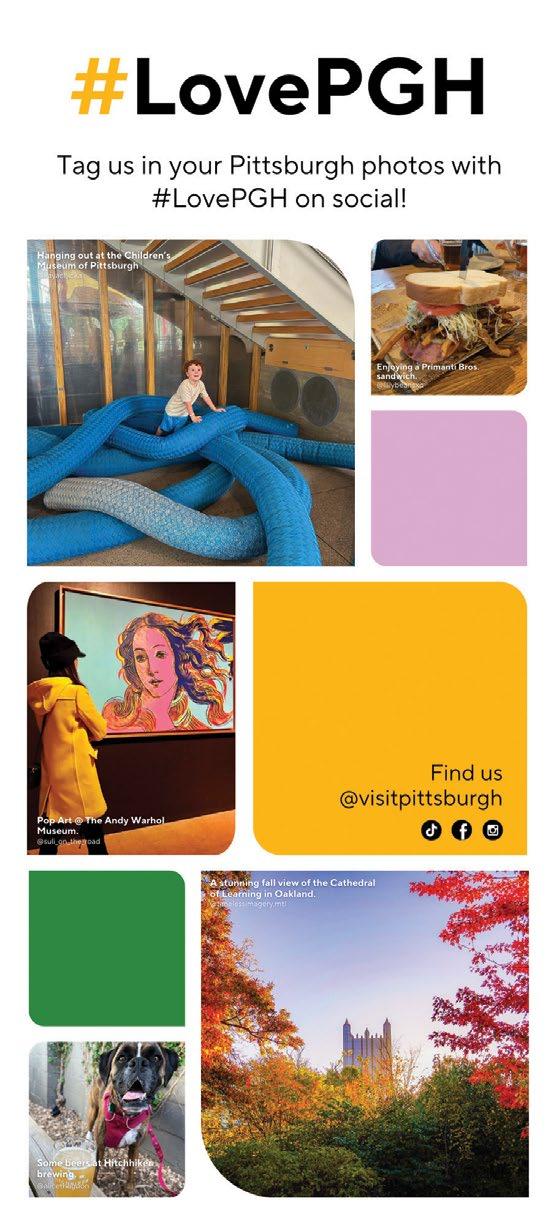 As we welcome visitors from around the world to Pittsburgh each year, we often hear first-hand about the surprise and delight found when exploring our destination. Our distinct four seasons, rolling hillsides and beautiful rivers make for a stunning backdrop no matter when you visit. Pair those incredible views with one of our 90 distinct neighborhoods, top-rated restaurants, thriving arts scene and must-see attractions, and suddenly you have the perfect long weekend. That’s where this guide you’re holding comes in.