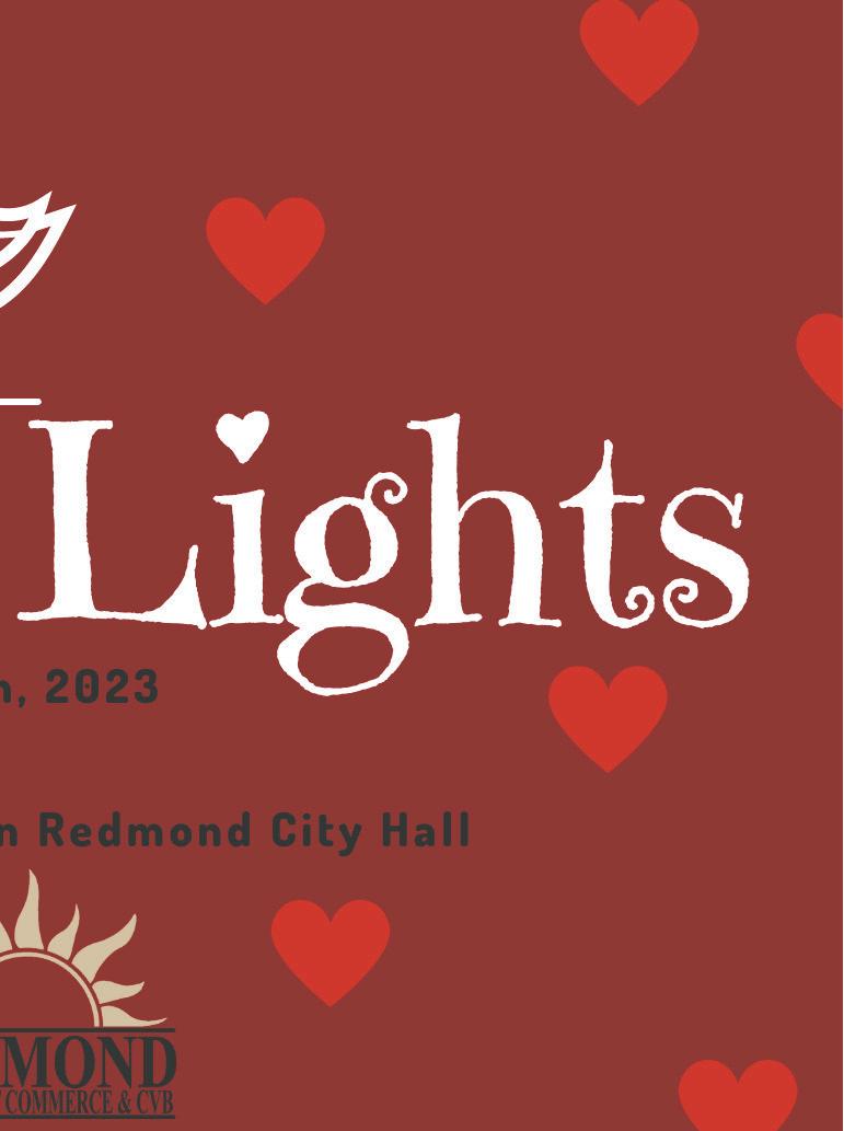 The Redmond Northern Lights are back! For one day only, on Feb. 14th, stop by City Hall to view this years' installment of the Valentine's Day Northern Lights! This year, we are bringing back love notes. Want to braodcast a message for that special someone on to City Hall? Reach out to Amanda Joe (events@visitredmondoregon. com. The Redmond Chamber of Commerce is proud to present the third annual installment of the February Northern Lights. Bring your sweetheart down to City Hall from dusk until around 9:00 PM and come see this year's new Valentines Day themed animated light display. While you're at it, grab a bite at one of our many excellent restaurants downtown and check out the deals some of our local businesses are having!