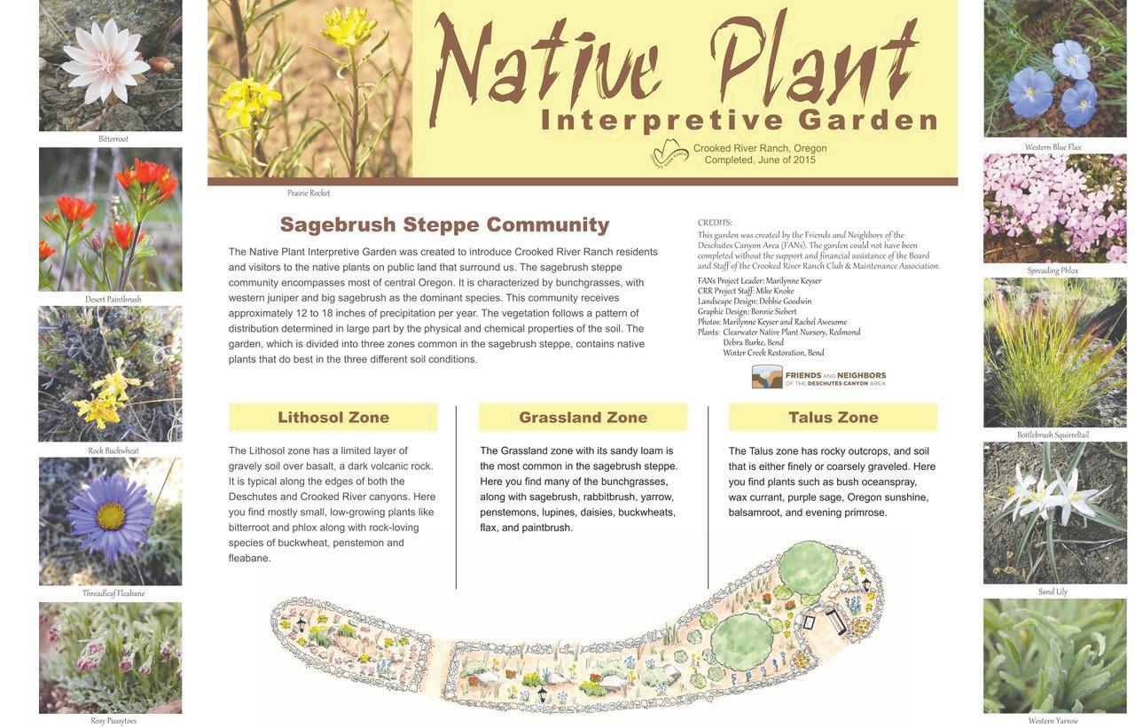 Crooked River Ranch has so many hidden gems within the Ranch community. If you have been down to the golf course or pickleball/tennis courts, you can hardly miss the beautiful Native Plant Interpretive Garden. In 2014 the raised planting area was home to the invasive Myrtle Spurge and non-native Cactus. Friends and Neighbors of the Deschutes Canyon Area [FANs] Native Plant Coordinator Marilynne Keyser had a vision for a native plant garden showcasing the wonderful and varied plants that are native to the High Desert and thrive in our climate with limited rainfall. Dedicated volunteers brought the initial native garden area project to fruition. With the grand opening on June 11, 2015. A vision of new plants with signage describing the plants along with a walking pathway began with the help of Andria Truax, owner of Great Basin Nursery in Bend, Marilynne and native plant enthusiasts Linda and Wayne Buttolph. Getting their ideas and visions together they developed the design for this raised desert plant garden. is includes a 160-foot-long garden, with over 500 plants representing over 40 di erent native species. It was important to them to have a lovely walkway for close plant viewing. New plants were added in April 2022 and thanks to more rain than normal that spring, the entire garden thrived. ey chose a gravel product for a hardy walking path with yearround enjoyment of the garden. As stated by Marilynne Keyser, the FANs educational garden is the largest one in the state. Despite the nibbling by local deer, the garden now displays native plants and grasses from early Spring through late Fall.