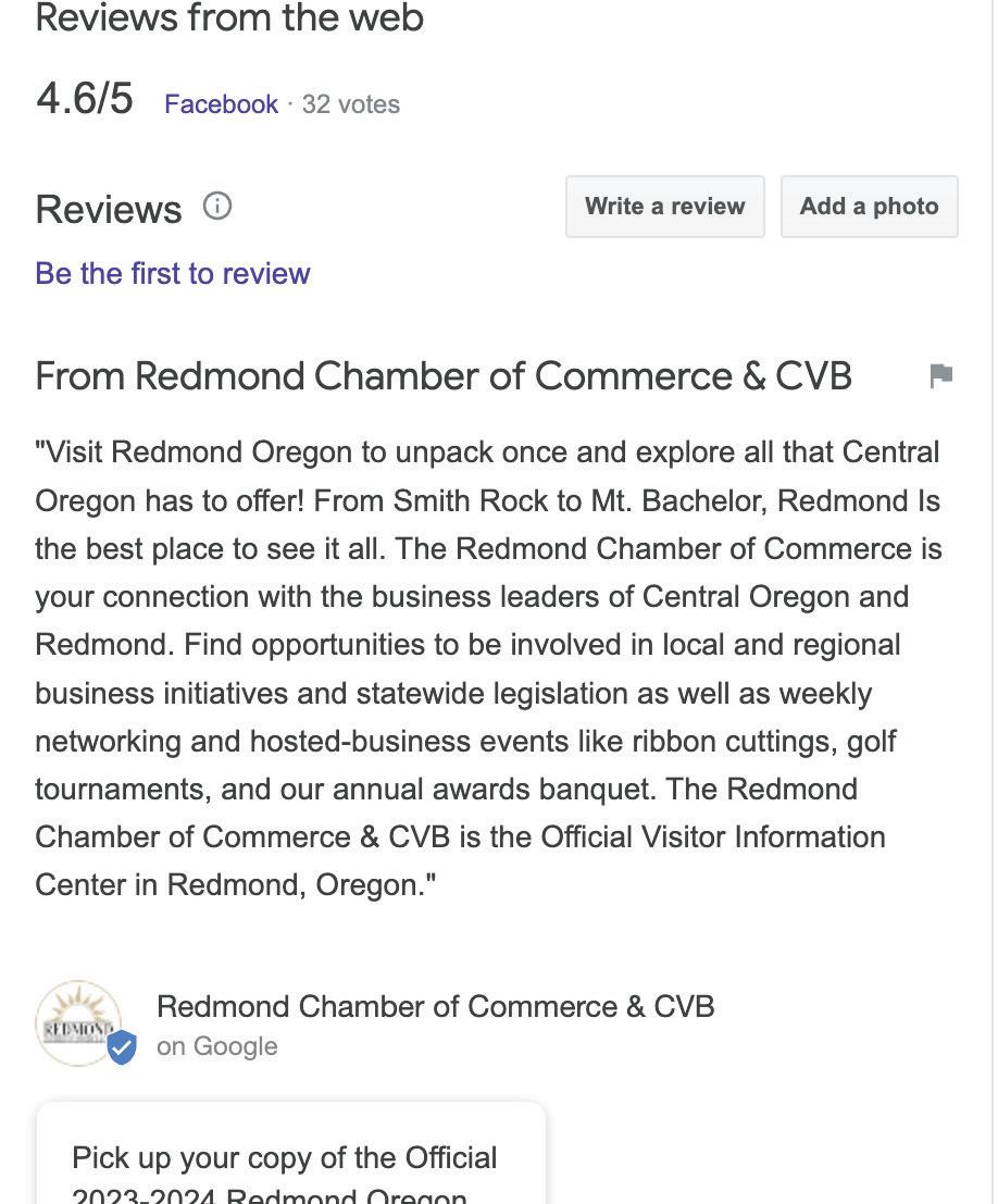 Google business profi les are also a great spot for customers to leave reviews on your products and services. As the profi le owner, you have the ability to respond and interact with people who leave reviews. These reviews will be some of the first comments that people searching for you see. On that note, please leave us a review the next time you search for the Redmond Chamber of Commerce!