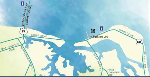 Y ALLER : Depuis le complexe hôtelier balnéaire, dirigez-vous vers le nord sur Pacific Avenue qui fusionne ensuite avec Atlantic Avenue (Route 60). Prenez à gauche sur Shore Drive (Route 60). Continuez vers l’ouest, à travers le Parc d’État de First Landing, jusqu’à la Baie.