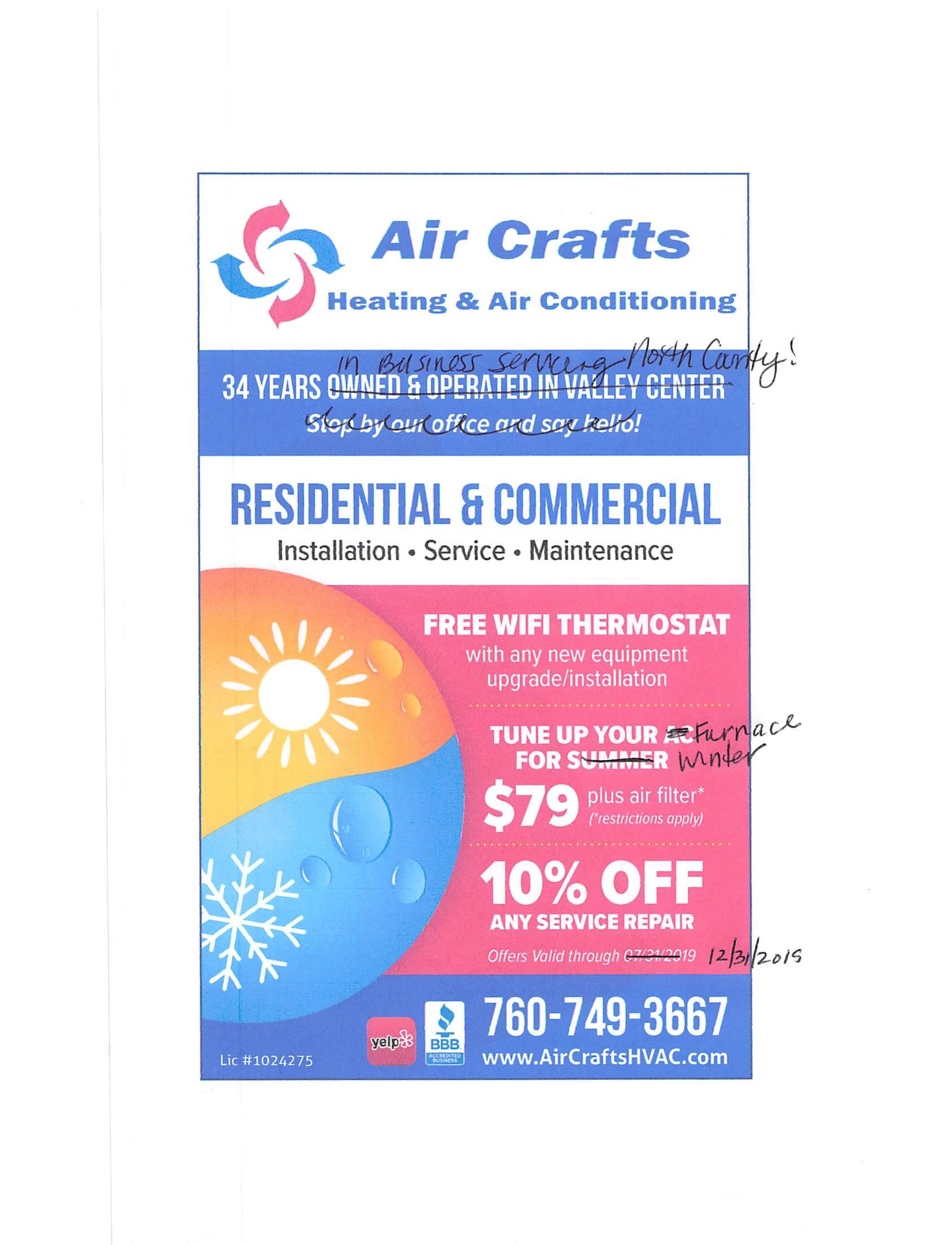 Air Crafts Heating & Air Conditioning (760) 749-3667 www.aircraftshvac.com
