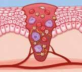 bactéries sont éliminés. Les vaisseaux endommagés se contractent pour minimiser la perte de sang et le système de coagulation est activé. En quelques heures, un réseau de fibrine se forme, servant de matrice pour le tissu de granulation. La fibrine colle les bords de la plaie et arrête le saignement en formant une croûte. De plus, la défense immunitaire cellulaire commence. Les macrophages commencent à phagocyter les germes et les débris de tissu. Très souvent, les plaies présentent des signes d’inflammation, c’està-dire qu’elles sont douloureuses, enflées, chaudes et rouges. Cette phase se termine au bout de trois jours environ. La phase de granulation est la phase de renouvellement des tissus. Les fibroblastes construisent un squelette sur le réseau de fibrine, dans lequel d’autres cellules provenant de la zone immédiate de la plaie sont implantées. Les fibroblastes produisent du collagène pour renforcer le tissu de granulation qui se forme. Les plaies à ce stade sont d’un rouge vif, humides et brillantes et semblent bien ir-