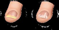 Typisch: verdickte, gelblich-bräunlich verfärbte, brüchige Nägel; ggf. Ablösung vom Nagelbett.