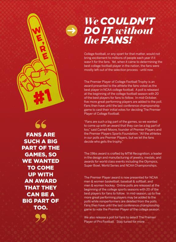 The Premier Player of College Football Trophy is an award presented to the athlete the fans vote as the best player in NCAA college football. The Premier Players Sports Foundation releases a poll at the beginning of the college football season with 20 of the best players for fans to follow. The foundation will add up to five more great-performing players to the poll in midOctober while deleting nonperformers from the poll. Fans then have until the last conference championship game to cast their vote for deciding The Premier Player of College Football.