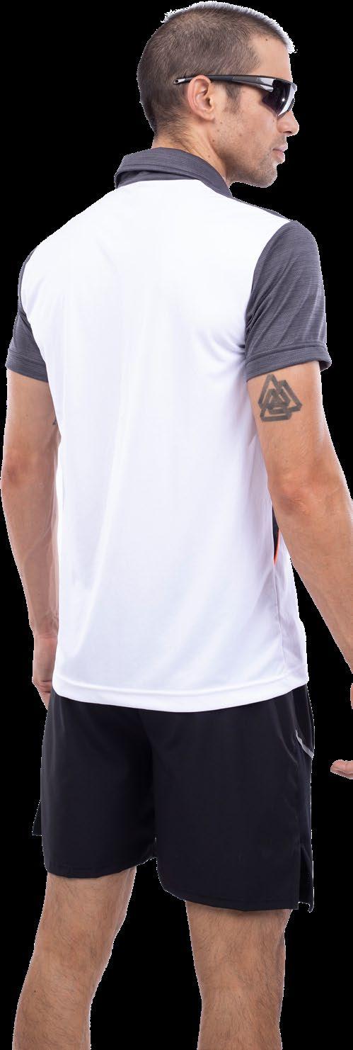 Remera cuello polo T.DRY combinada con recortes y vivo en power soft microperforado jaspeado. Lleva stamping 3D como avío marcario