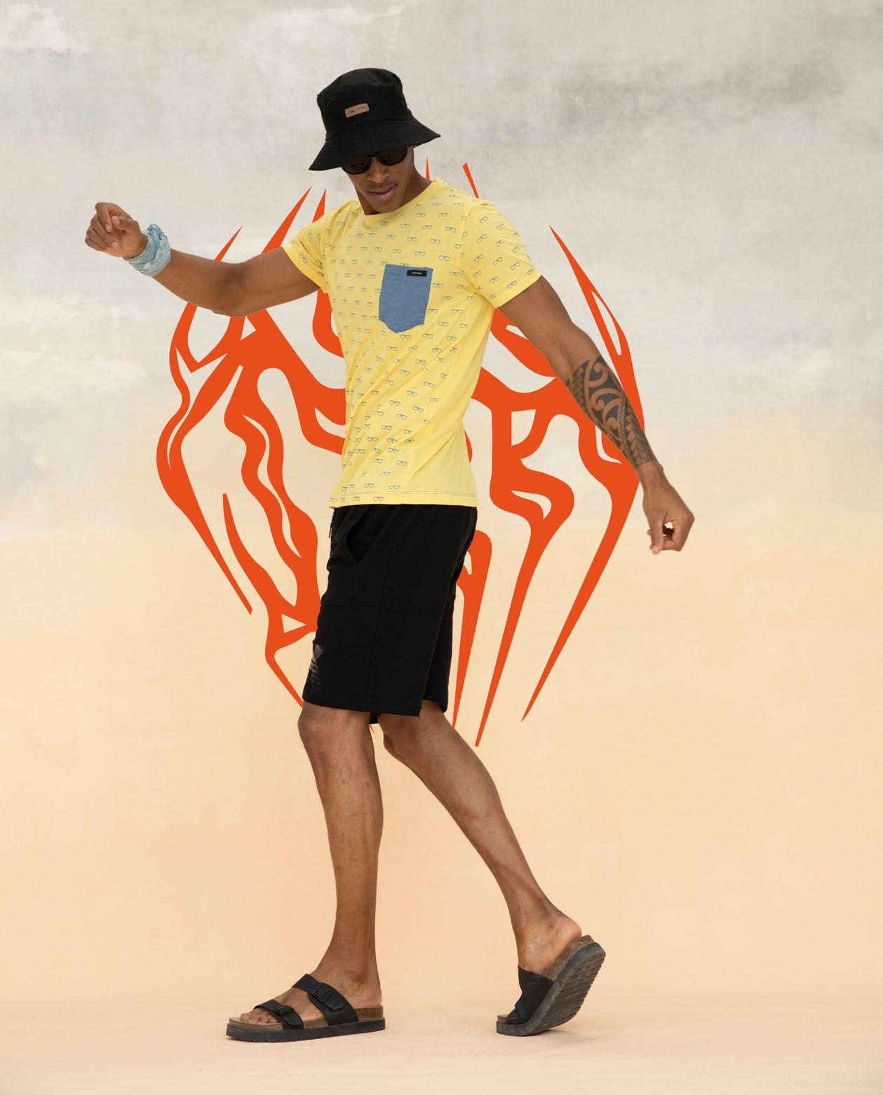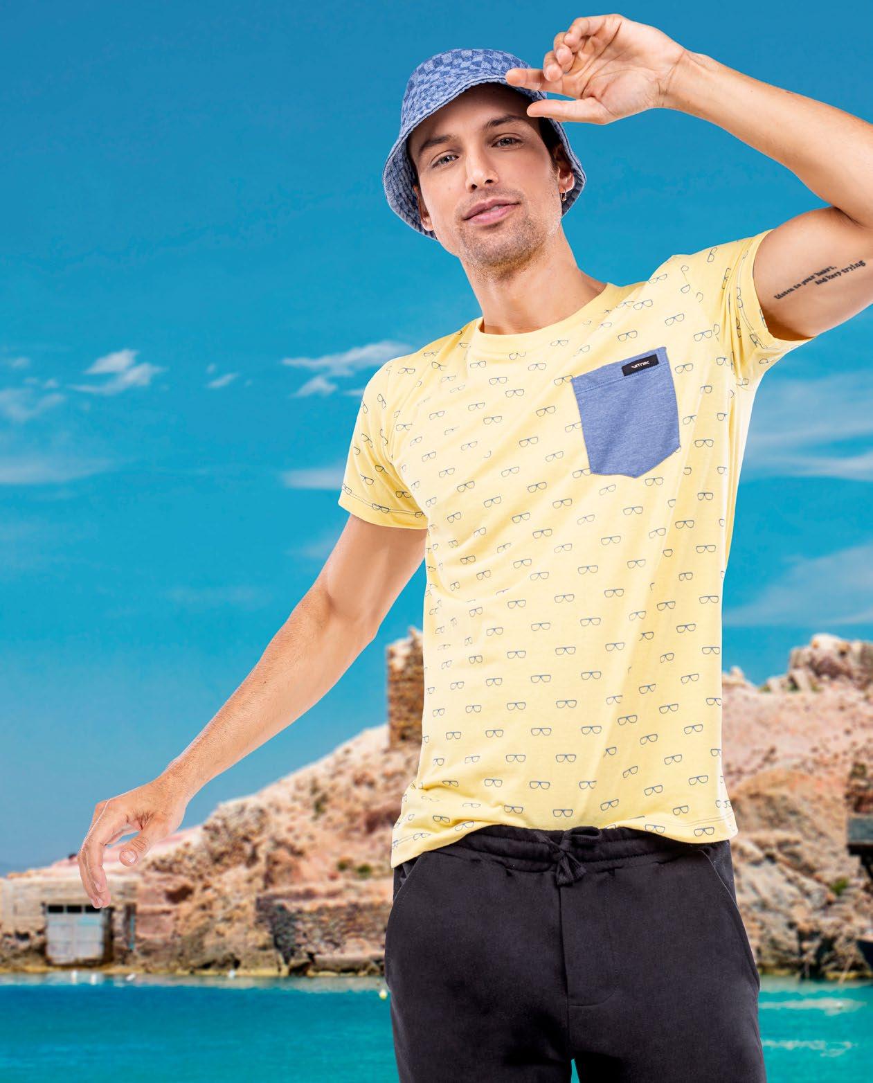 42LOVE DESTINATION | ESCAPE TO SUMMER Remera jersey fine delantero y mangas estampado full print anteojos. Tiene bolsillo a contratono $549990 67-0833-1M S/M/L/XL Short de baño microfibra con estampa al tono técnica vinilo. Cuenta con bolsillos laterales y uno atrás $659990 08-4606-02 S/M/L/XL