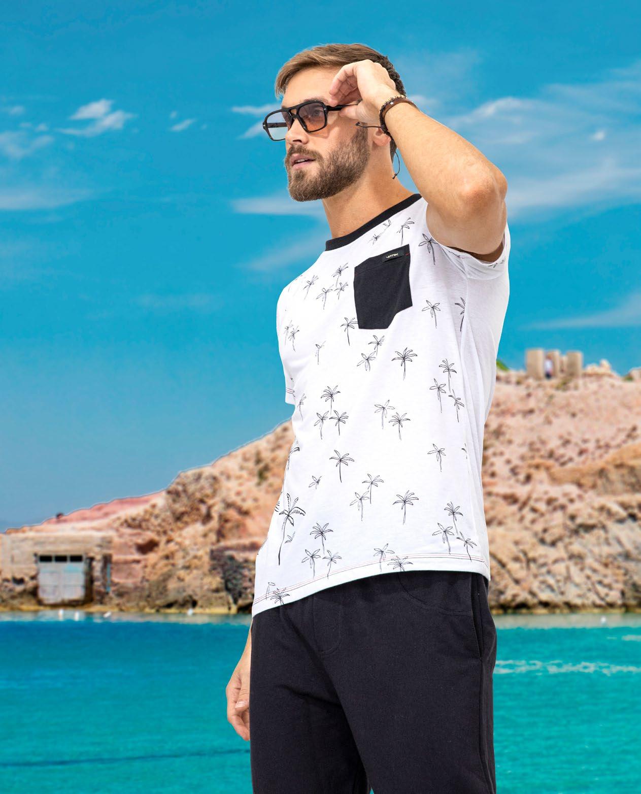 39LOVE DESTINATION | Remera jersey fine delantero y mangas estampado full print palmeras. Tiene bolsillo y cuello a contratono $549990 67-0834-01 S/M/L/XL