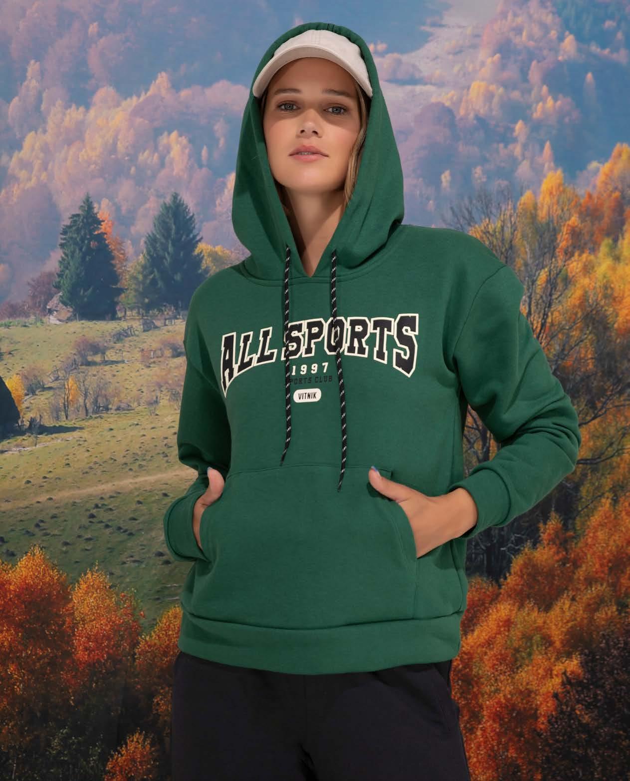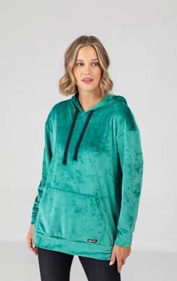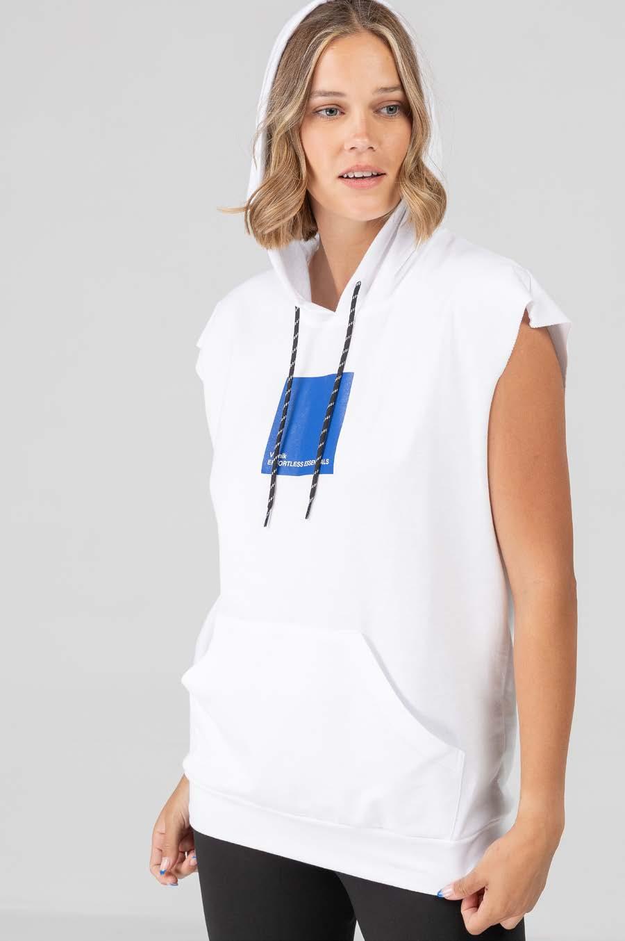 Chaleco corderito con capucha y bolsillo canguro. Terminaciones combinadas en engomado negro Línea suelta