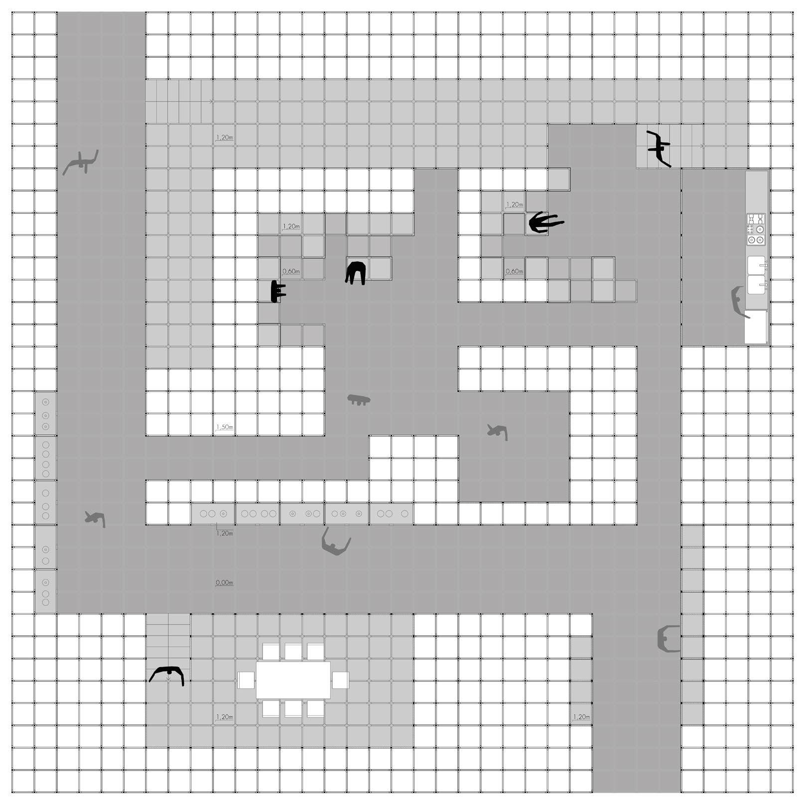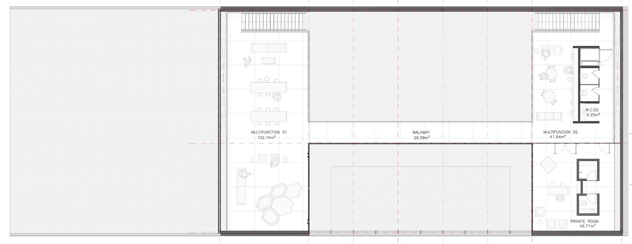 The upper oor consists of a raised platform with multiple functions, extending throughout the building and facing the atrium facades. Additionally, a private room is located on this oor.