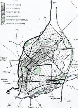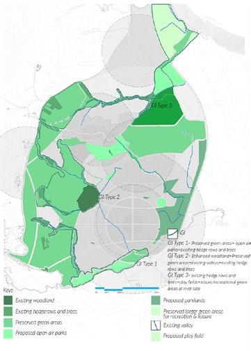 The development is concentric, with higher-density mixeduse areas in the east-south corner, featuring commercial ground floors, offices, pubs, and public spaces. The proposal includes extensive green infrastructure (GI) for public recreation, relaxation, social interaction, pedestrian greenways, and cycling. Green spaces are preserved to provide a green offset in housing areas. GI Type 1 covers preserved green areas, parks, hedgerows, and trees, creating a multifunctional connection between the A road and the town center outskirts.