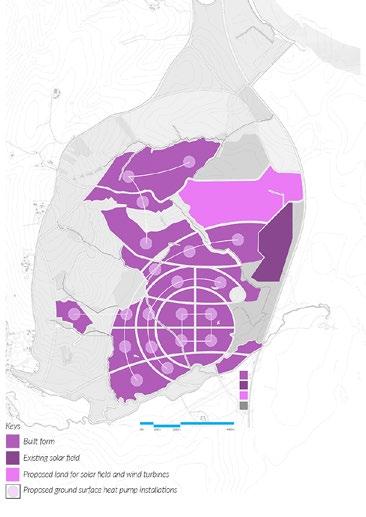 The proposal aims to achieve sustainability by designating a 33-hectare area (as per Eco Town Criteria 2009) for easy neighborhood access. It includes educational facilities for all age groups, various social gathering spots, and spaces for urban agriculture and tourism income. The plan emphasizes eco-friendly living, retaining the existing solar field and adding a 10-hectare area. Wind turbines are positioned on the eastern side near the river, and passive design principles are recommended to reduce heating and cooling system usage.