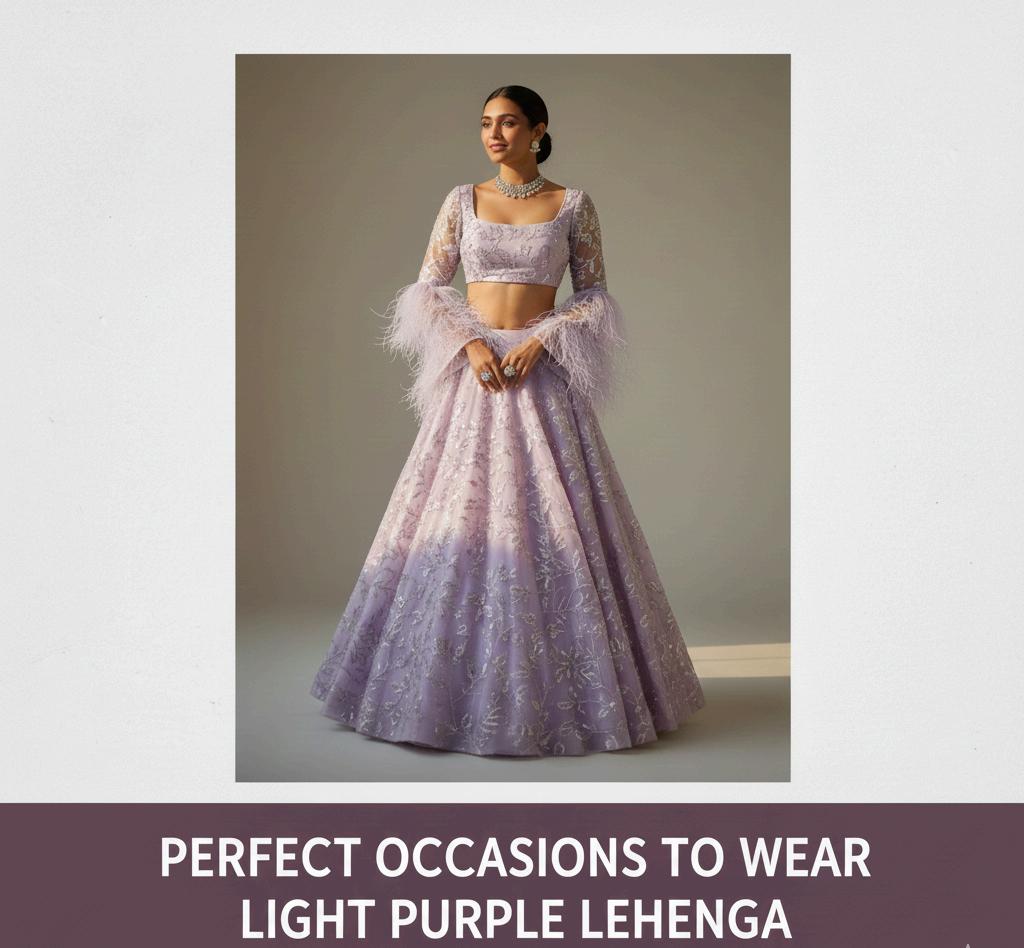 A light purple lehenga gives a soft and fresh look that fits many events The tone suits many skin shades and blends well with a square-neck blouse The feather embroidery adds a light finish that feels new and clean This makes it easy to wear for long hours without stress