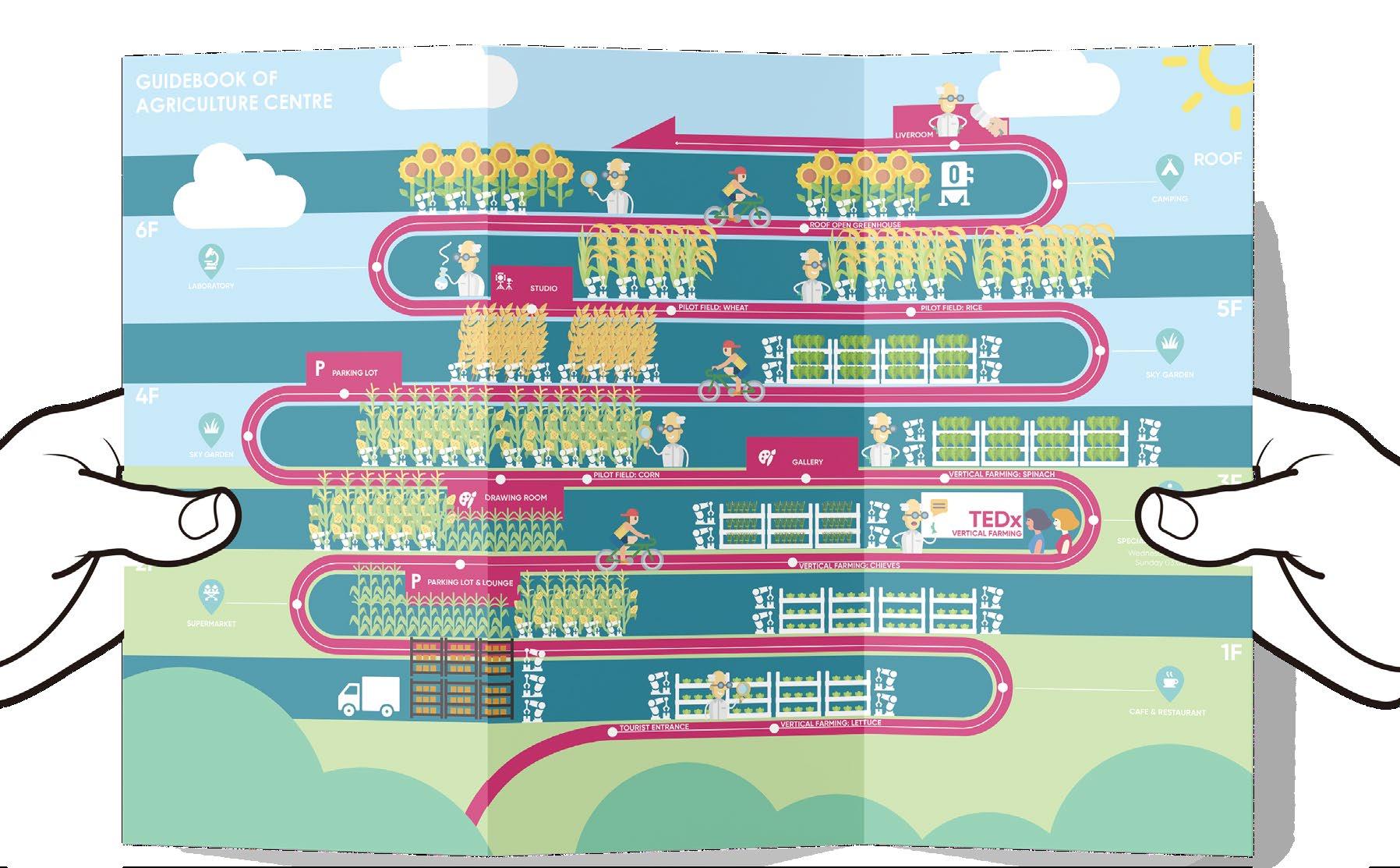 1. indoor rice experimental field 2. roof open greenhouse 3. camping platform 4. platform 5. parking 6. art gallery 1. indoor wheat /maize experimental field 2. vegetable cultivation 3. lecture hall / greenland 4. laboratory / greenland 5. photography studio 6. painting room 1. vegetable cultivation 2. packaging lines 3. cafe & restaurant 4. supermarket 5. staff platform