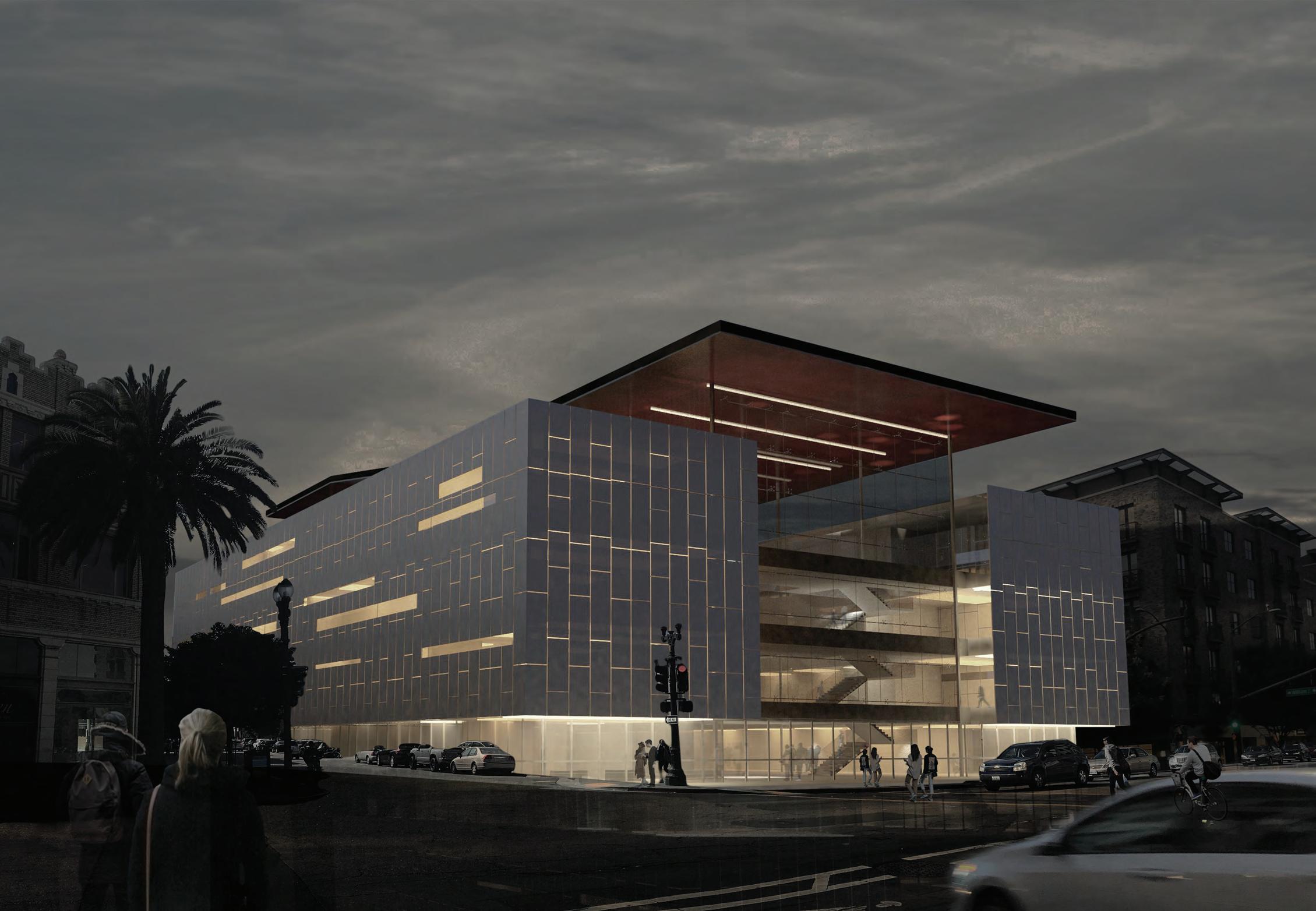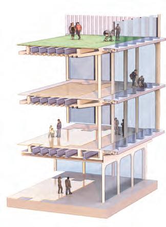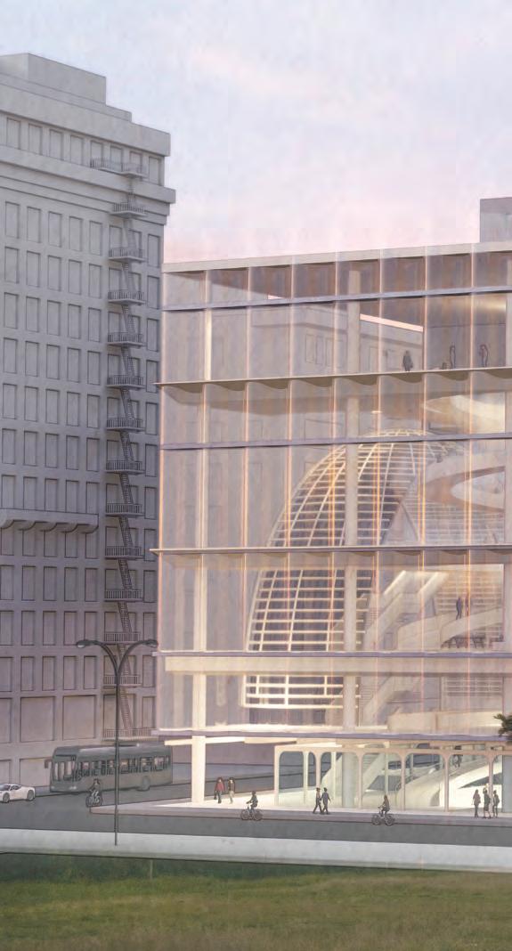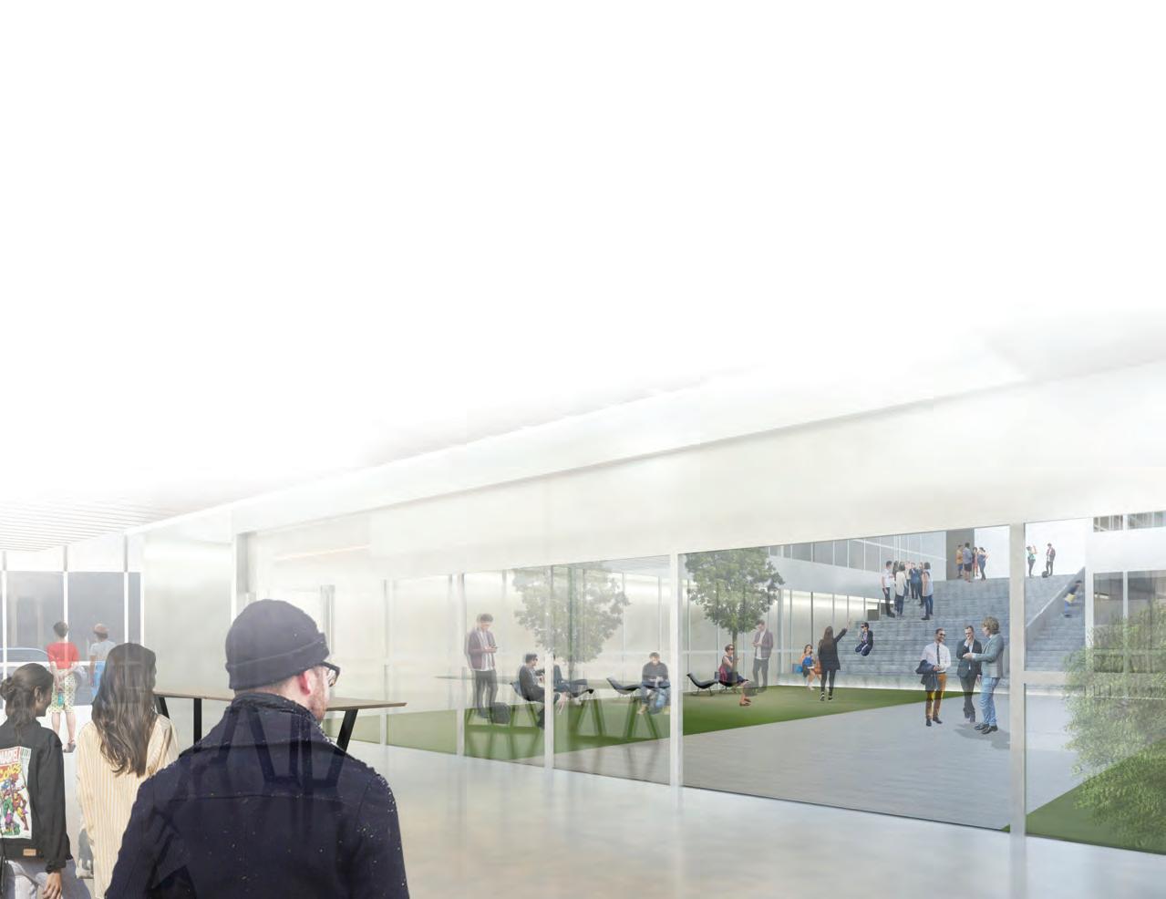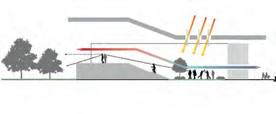 user a dynamic walking and viewing transition. After entering the building from ground level, user can choose either hanging out at the courtyard, or take the stair up to the outdoor plaza to enjoy theview of downtown Oakland. This transition in elevation also promote ventilation path for the building. This notion allows indoor and outdoor air exchange.