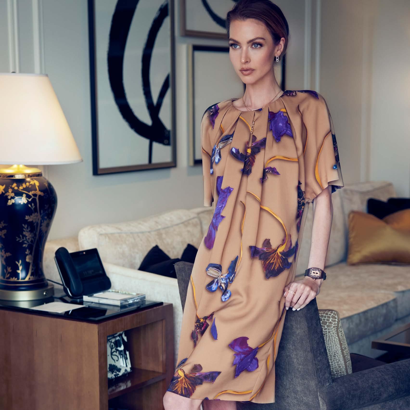 Watch by Richard Mille Earrings, Necklaces and Ring by Messika Jewelry Dress by Escada