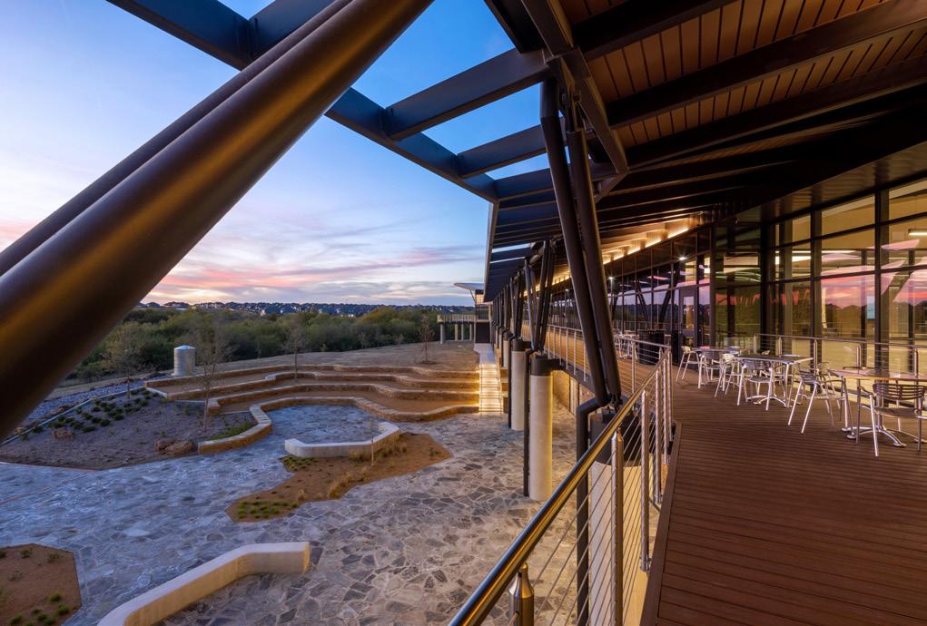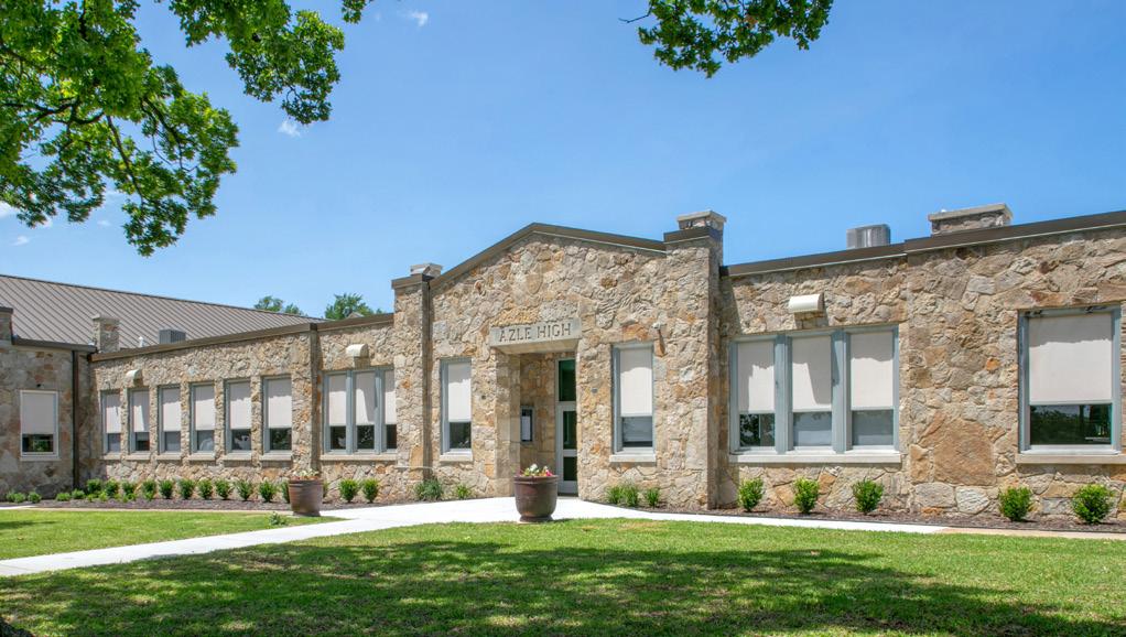 EMS ISD consolidated the school district’s administrative and professional development functions, while providing a field trip destination for K-12 natural science classes and serving as a community hub. The district desired a building that would bring its staff closer together in a calm and inviting atmosphere with visual connections to the natural outdoors all while nurturing a culture of creativity and collaboration. The resulting design sits on the site in a quiet reflective pose similar to a park building or nature center. The building is faced inside and out with golden brown stone with deep raked joints complimented by a dark gray cement panel system and glass walls framed with dark bronze storefront. The semi-rural location of the building led to the incorporation of a sit-down bistro with full-service breakfast and lunch, along with a micro mart serving healthy grab and go food throughout the day. The building features direct access to Marine Creek Lake and is connected to a six-milelong nature trail. Two natural science classrooms are located on the lower level to accommodate student field trips and specialty science activities. These have operable glass walls allowing for outdoor teaching, exploration, and field experimentation. A boardroom featuring large glass walls has access to a raised outdoor walkway and nature overlook. This outdoor walkway runs along the entire western side of the building under a deep sheltering roof overhang adjacent to floor-to-ceiling glass exterior walls with views to the woods and lake. The walkway is intended to encourage employees to traverse outdoors rather than indoors during the workday. 2022 Year