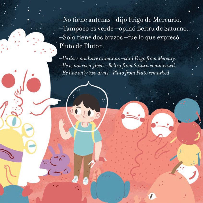 Este cuento, escrito en simultáneamente en español e inglés, cuenta la aventura de un niño llamado Simón, quien llega a un nuevo colegio, es un lugar muy extraño; sus compañeros lo ven diferente a ellos; no tiene antenas, tampoco es verde, sólo tiene dos brazos… Simón también los encuentra curiosos; son ustedes muy extraños, pero parecen amigables… ¿Quieren ser mis amigos? ¿Qué sucederá?