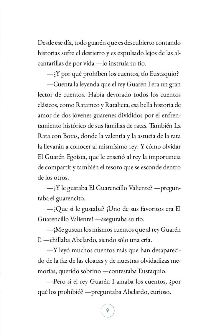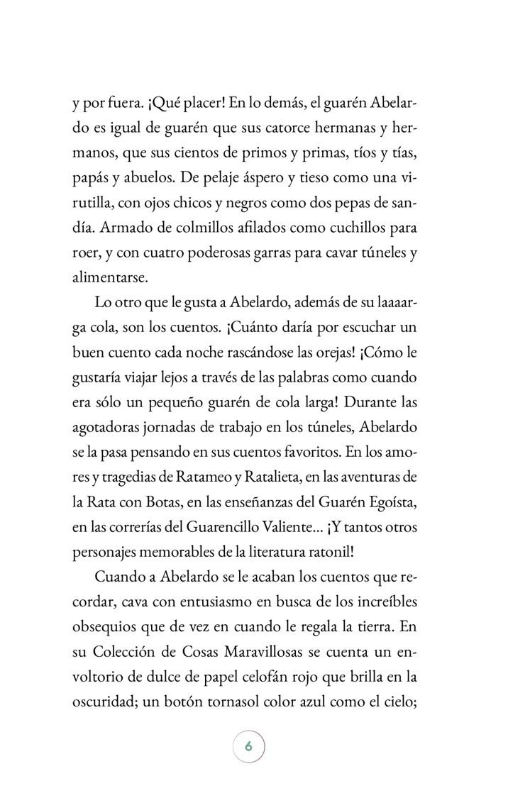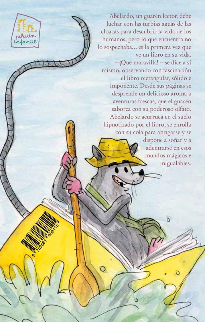 Abelardo es un guarén que debe luchar con las turbias aguas de las cloacas para descubrir la vida de los humanos, pero lo que encuentra no lo sospechaba... es la primera vez que ve un libro en su vida. —¡Qué maravilla! —se dice a sí mismo, observando con fascinación el libro rectangular, sólido e imponente. Desde sus páginas se desprende un delicioso aroma a aventuras frescas, que el guarén saborea con su poderoso olfato. Abelardo se acurruca en el suelo, hipnotizado por el libro, se enrolla con su cola para abrigarse y se dispone a soñar y a adentrarse en esos mundos mágicos e inigualables que esperan a los lectores dentro de cada libro y que vivirán para siempre en sus corazones.