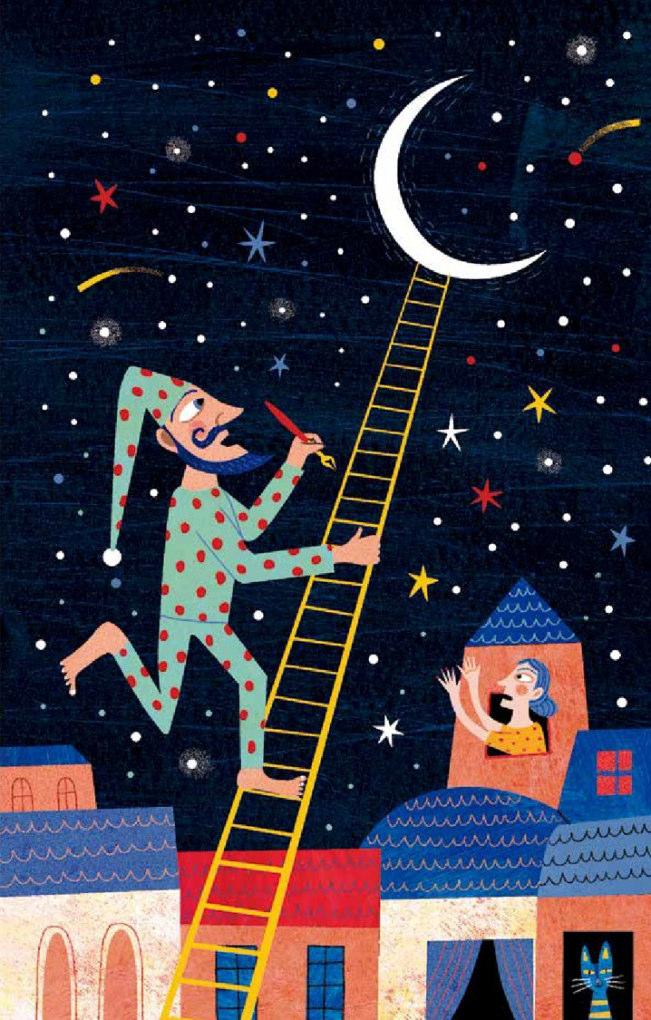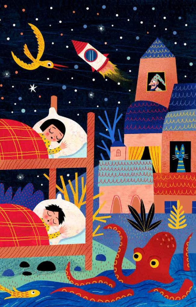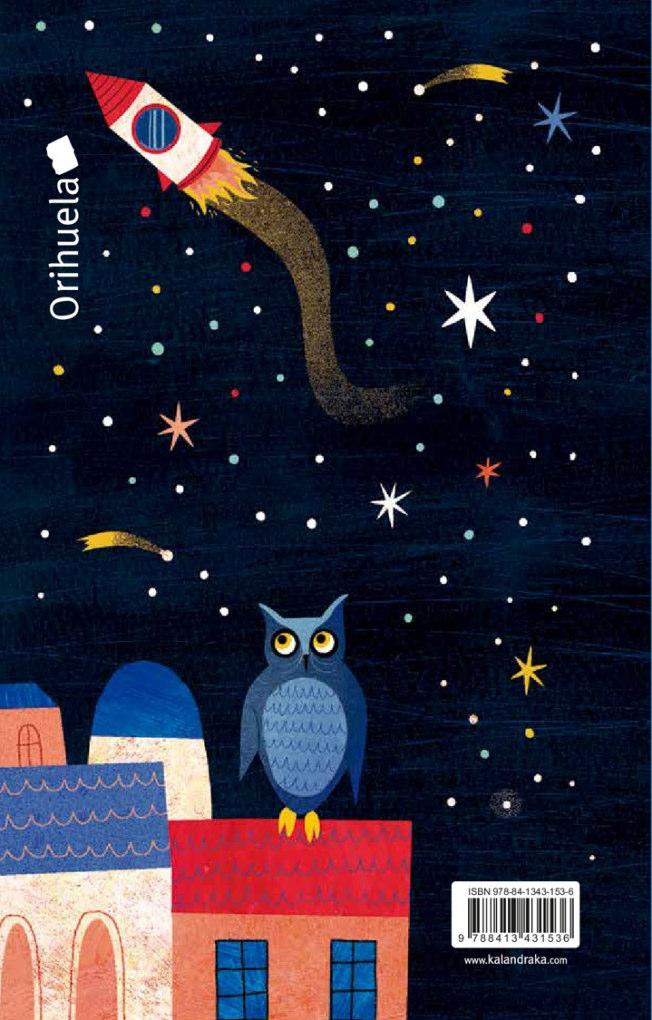 Rhymed, funny, musical verses, sometimes inspired by formulas from the oral tradition (lullabies, circle games, riddles, etc.), that run through the nights showing us a multitude of characters: the moon, the stars, the fish, the fox, the sheep, a sheet turned into a ghost or the garbage truck. The illustrations by Mariana Ruiz Johnson, in vivid and intense colours, bring light to this nocturnal collection of poems, ideal for sharing before going to sleep. Among them, a double-page illustration that follows the echo of the previous compositions and serves as an introduction to the poem that precisely gives the work its title stands out.