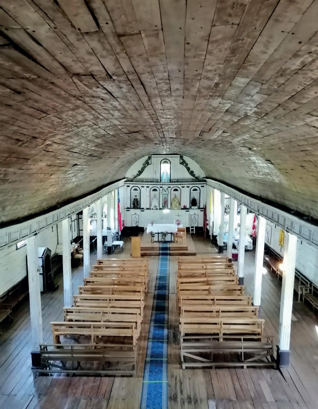 En una tesitura menos refinada —más rústica y no por ello menos valiosa—, la carpintería de las iglesias chilotas alcanza niveles de notable calidad. En este caso, sería injusto no considerar en la materialización el poderoso influjo de las comunidades que, de manera no explícita, participan en buena parte de las decisiones.