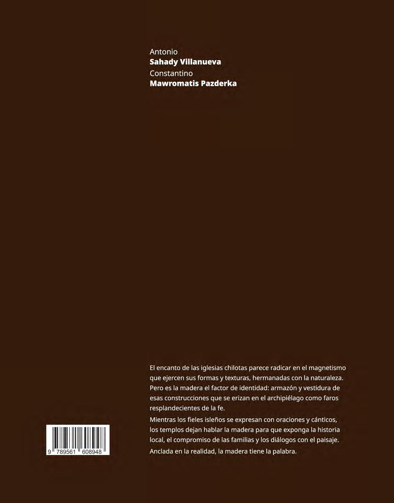 Los autores sostienen que la madera, especialmente la chilota que se aprecia en sus iglesias, tiene voz. Ellos la han escuchado con afecto y dedicación desde hace años y la hacen audible para nosotros(as) en este libro. No tengo dudas que Antonio Sahady y Constantino Mawromatis tienen “madera”, es decir “disposición y aptitud particular”1 para la actividad que realizan, traduciéndonos esos sonidos de lo que parece un murmullo, pero que ellos convierten en lenguaje y código de un relato que desde la arquitectura se desplaza a las experiencias religiosas colectivas y a su engarce con la naturaleza. Si las iglesias chilotas conforman un patrimonio mestizo y se erigen como dones a Cristo, a las vírgenes y a los(as) santos(as) que protegen como patronos(as) a las comunidades, este libro es también parte de los