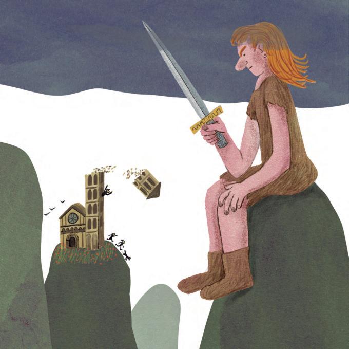 ... y que una a ladísima espada cortaba la torre de una iglesia.