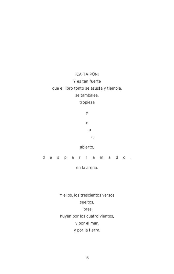 Un poemario que invita al juego literario: aquí están los versos que huyeron por aire, por mar y por tierra. Los primeros se los tragó un gallo-veleta; los segundos los encontró la sirena Flora; y los últimos los recogió un escarabajo pelotero.