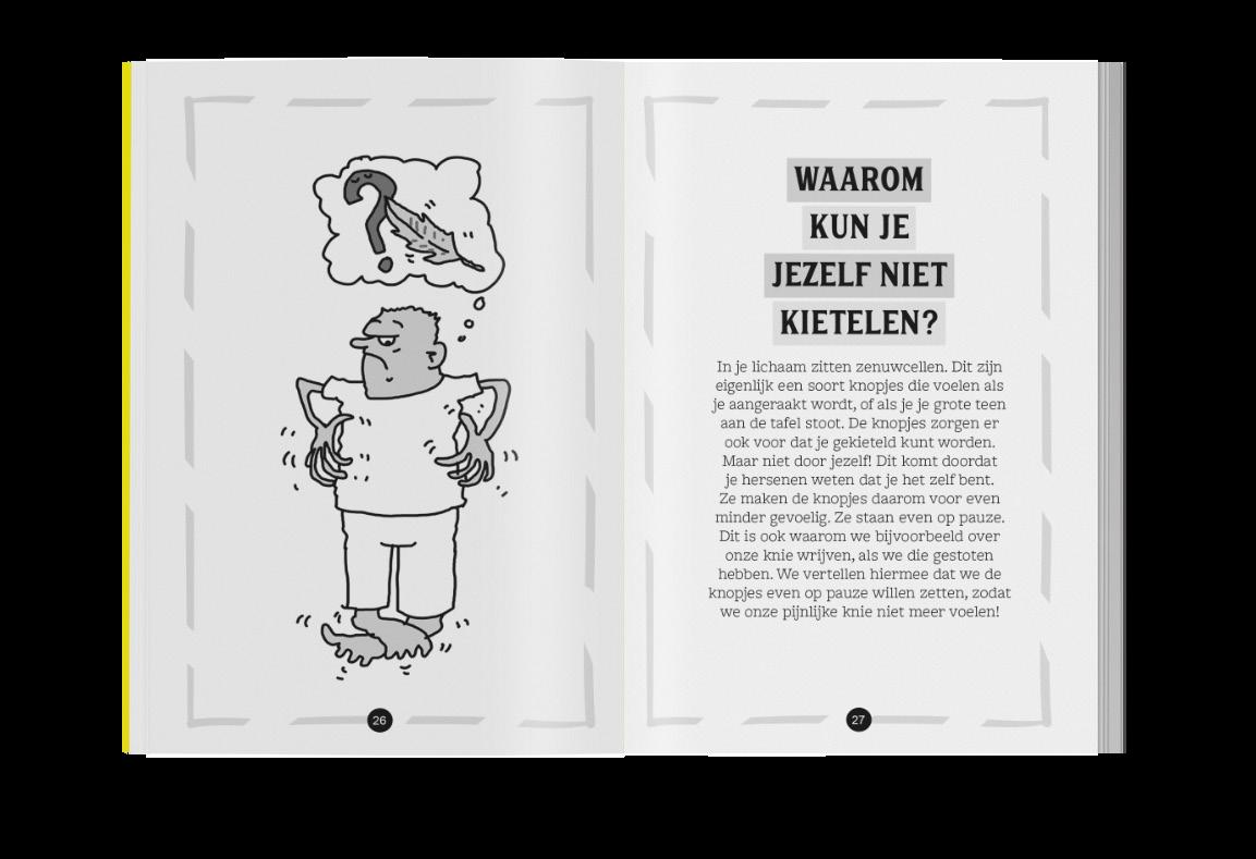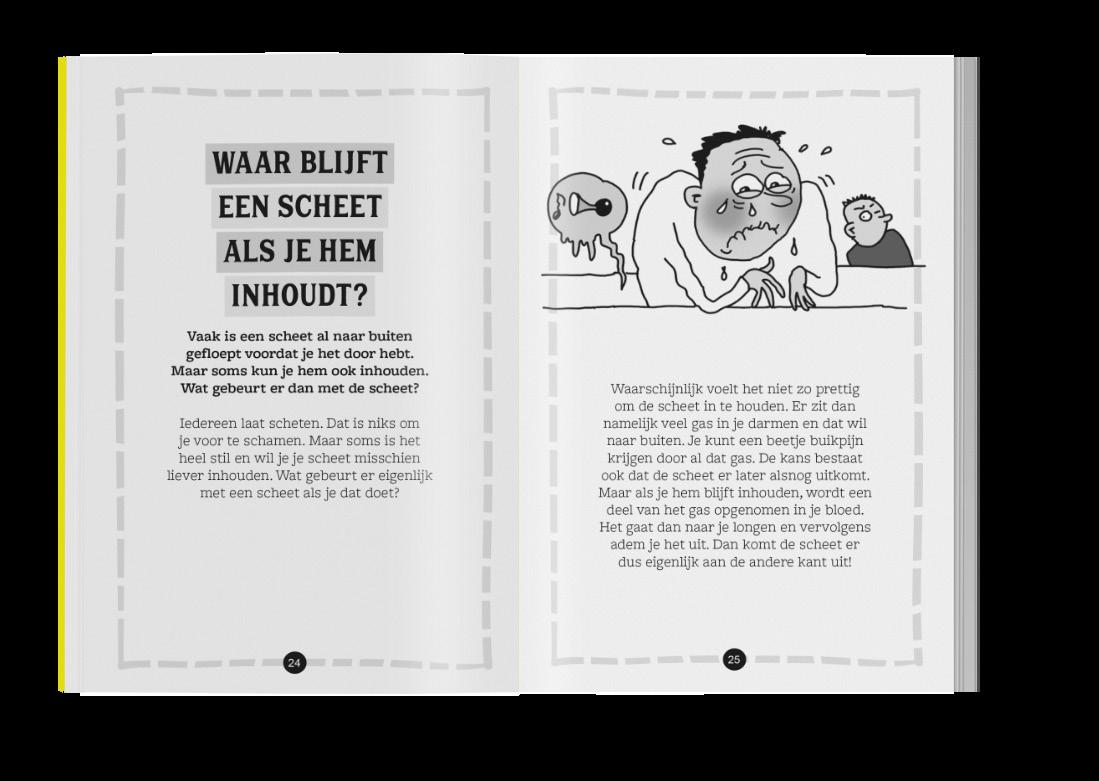 Waarom kun je jezelf niet kietelen? Hoeveel snot maak je per dag aan? Waar blijft een scheet als je hem inhoudt? Het antwoord op deze en nog veel meer toffe vragen lees je in dit boek. In dit vermakelijke boek voor kinderen van 8 tot 12 jaar leer je in welk lichaamsdeel een bijensteek het meest pijn doet, wat er gebeurt als je voet slaapt en waarom je soms de slappe lach hebt. Elk feitje is vergezeld van een grappige illustratie.