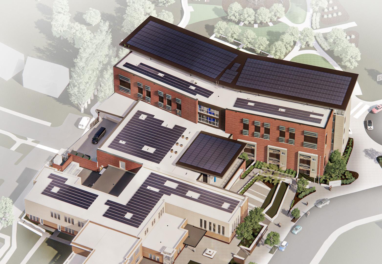 A photovoltaic array is being installed in 2023 via a Power Purchase Agreement – which requires no cost to the school system and will deliver power at a fixed rate for 25 years. The building massing steps up from south to north so higher roofs don’t shade lower ones, maximizing the rooftop “solar real-estate”.