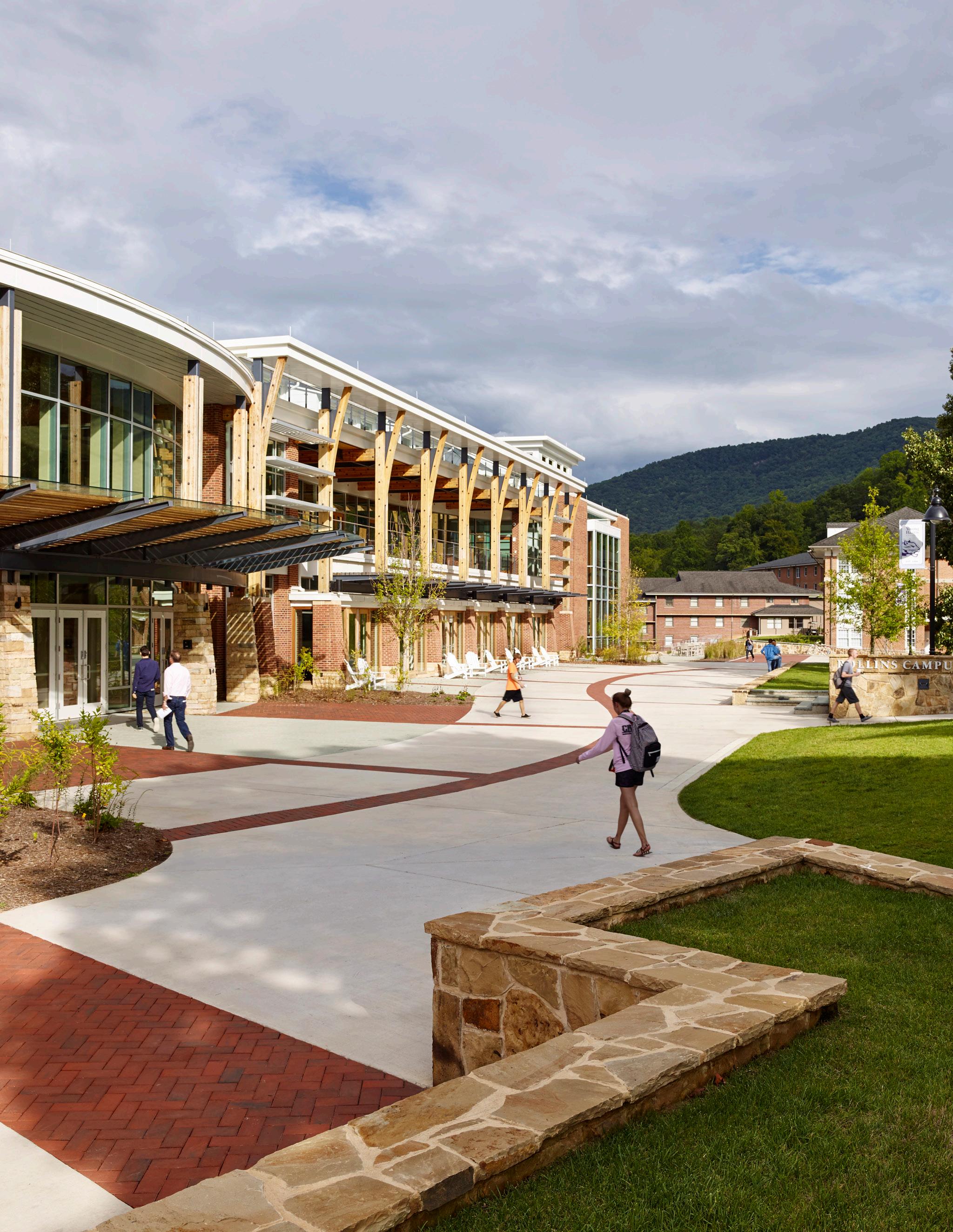 By pulling in prominent campus pathways and by opening up to active, programmed outdoor spaces, a union building can reach out to its surroundings, provide a clear center of gravity for campus activities, and carry forward the unique identity and individual character of the institution.