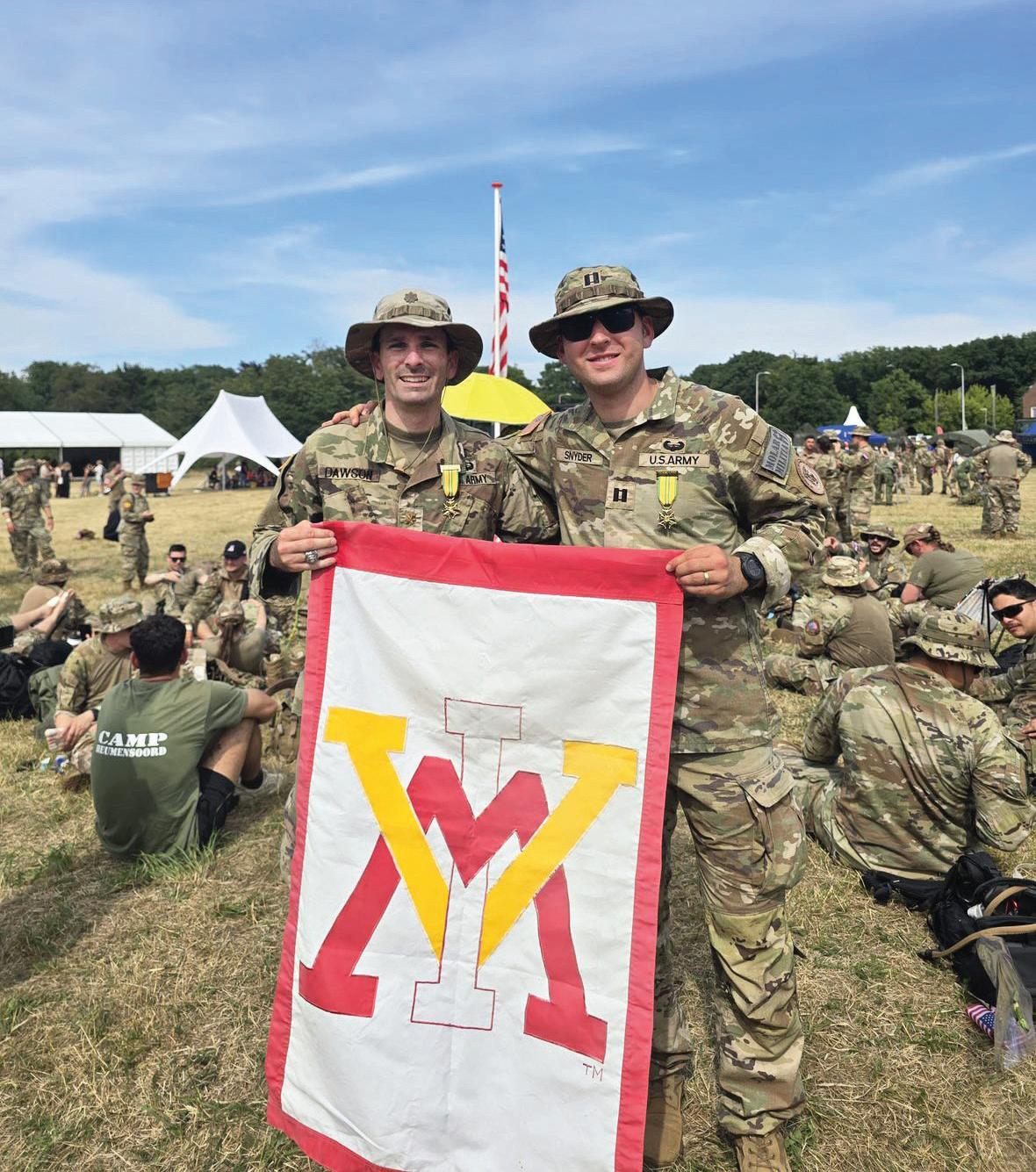 U.S. Army Maj. Fritz Dawson ’13 (left) and Capt. Conor Snyder ’18 complete the Internationale Vierdaagse Afstandsmarsen Nijmegen, the largest multiple-day marching event in the world, in Nijmegen, the Netherlands, in July 2025.