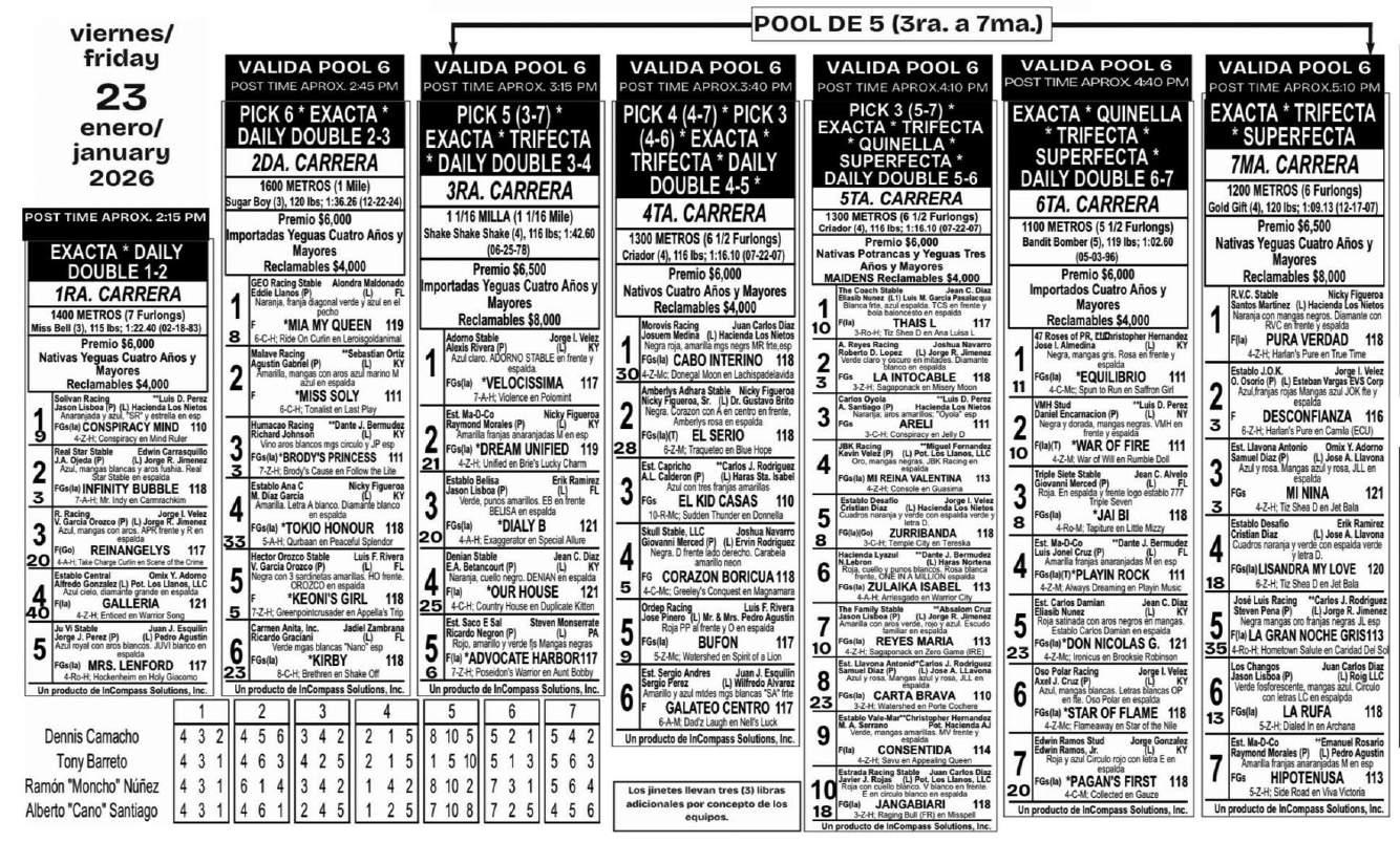 Solo una de las siete carreras presenta un grupo de diez corredoras en busca de su primera victoria. Esta es la quinta en la que participarán nativas de tres años y mayores reclamables a $4 mil. Nuestra favorita en este evento lo es Jangabiari, que de paso es la fija de la recomendación para el Pool de seis.