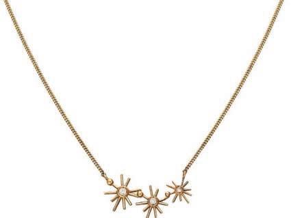 El collar “Buenos Días” incorpora un mini sol inspirado en petroglifos taínos, con rayos que evocan celebración y nuevos comienzos, acentuados por diamantes blancos sobre oro amarillo de 14 quilates.