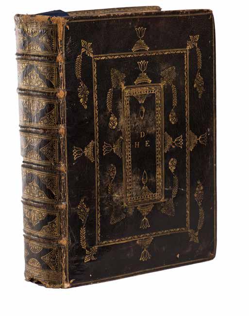 Superbly bound in contemporary panelled tan calf, upper and lower boards (10mm thick) with lavishly decorated gilt tooled borders, inner panel framing a laurel wreath in gilt. Spine with seven raised bands and eight compartments richly decorated in gilt using a wide array of ornaments including flower and leaf motifs, strapwork, vines, arabesques and dots. Doublures richly decorated in gilt using the same tool as the border to one of the panels on the boards.
