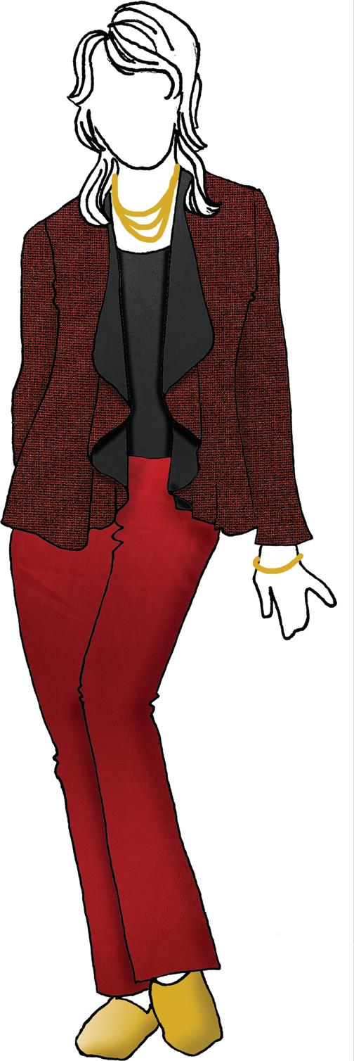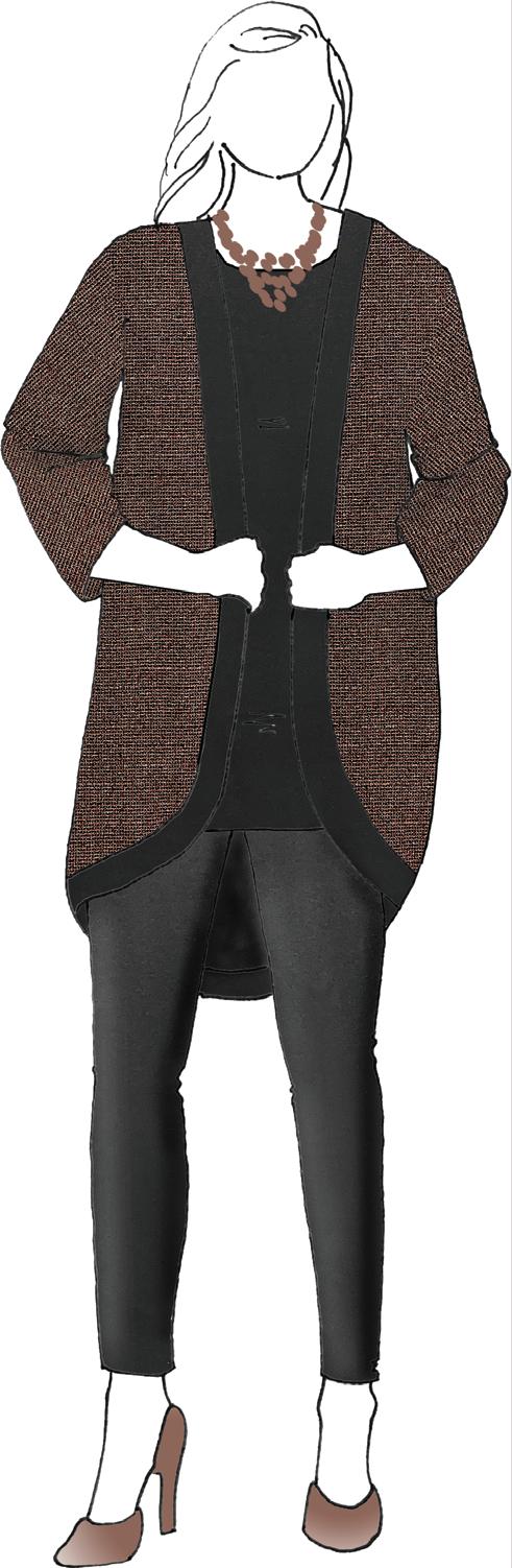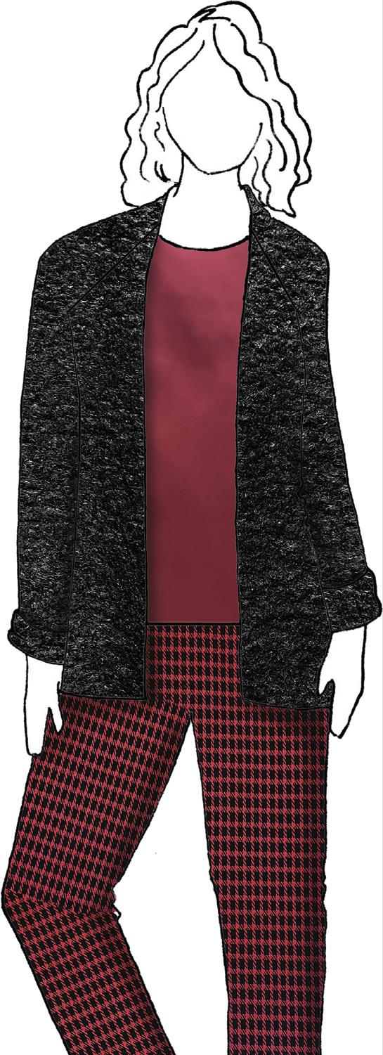 Keeping things festive for the holidays and beyond, make sure to order Suite Curly, a lightweight and soft bouclé sweater knit. Add a touch of whimsy to any outfit with its fun texture. Wear it as a long sweater belted over an ankle-length knit dress sewn from Suite Eastwick, an extra-wide cottonrich medium-weight jersey. If you live in a colder climate, choose this knit for a long-sleeve mock turtle-neck to wear with your bouclé cardigan and Belle slacks. Easy.