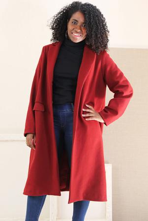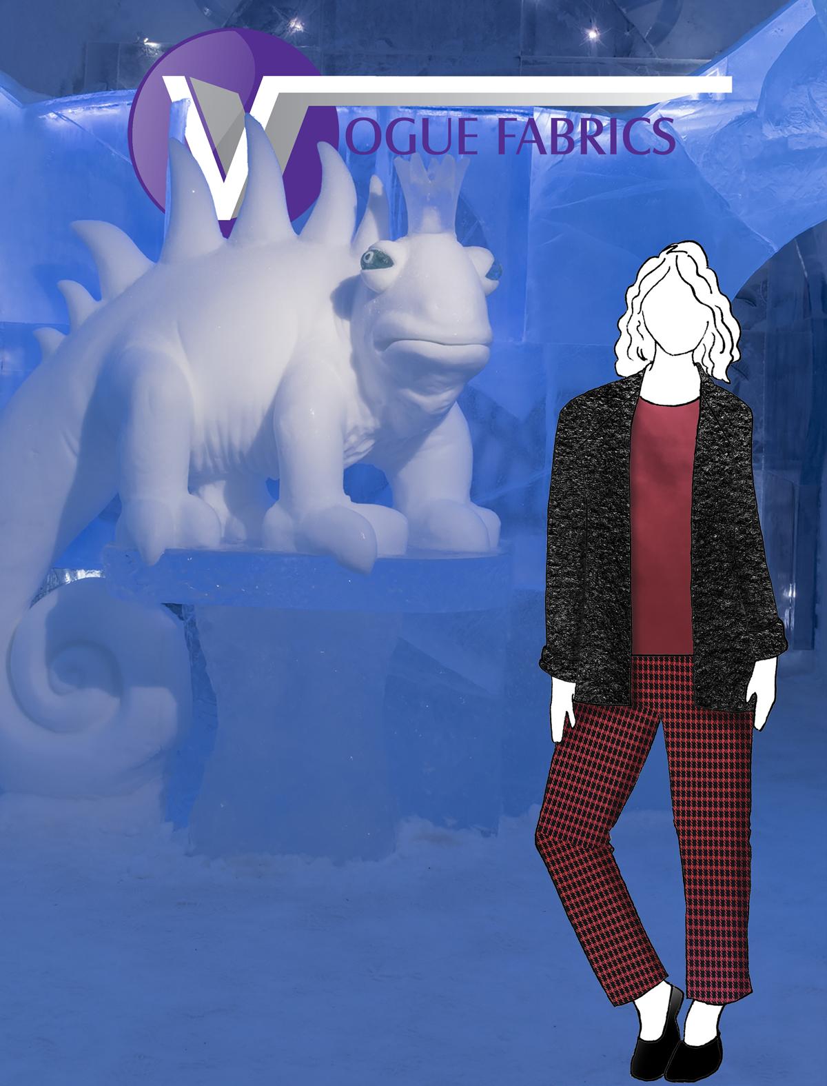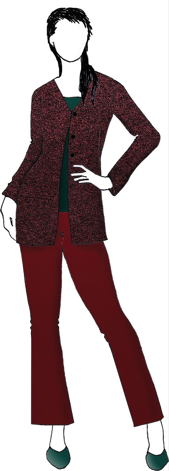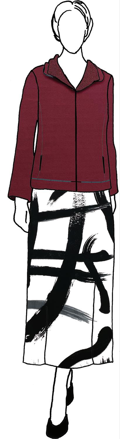After the wonderful response to the bouclé sweaterknits in Russet and Navy in the Fall 2025 catalog, we knew we had to showcase the black - it’s the last of the colors available from the supplier. Choose Chill Bouclé for making sweater coats, warm vests, and cardigans. It’s shown here as a topper to Chill Grid, a wonderful yarn-dyed luxury knit that feels like a high-end ponte. It was such a challenge to find the perfect matchmate to bring out the beautiful garnet color, but we did it! Chill Scarlet is another of our popular low-luster cotton sateen fabrics that work well as pants, skirts, jackets, and dresses. Get creative with your fashion skills to create a stunning outfit.