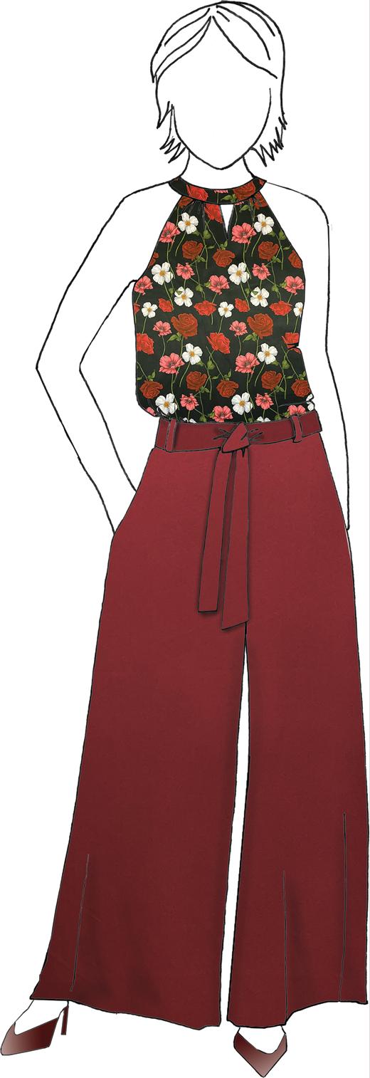 Remember the hunter green stretch-twill in the previous collection? Here it is in a shade of red that can take you from Christmas to Valentine’s Day effortlessly. Tailor some classic Bevvy Cardinal trousers to wear with the floral print top.