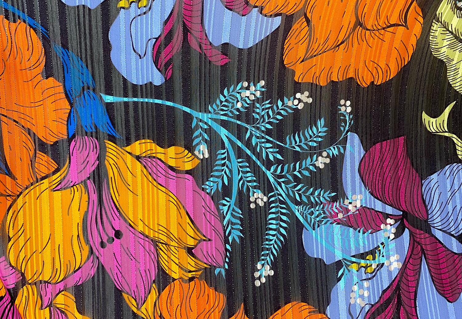 Bevvy Fuchsia is a low-luster stretch satin from our store’s Temptress Collection. It’s easy to sew and delightful to wear. If you take our advice and make a satin sheath dress, level up its fashion with a sheer kimono-style jacket or a sheer pull-over made from this stunning chiffon/satin/shimmer print. Bevvy Donnatella combines bold design with romantic fashionability worthy of the Italian great fashion houses.