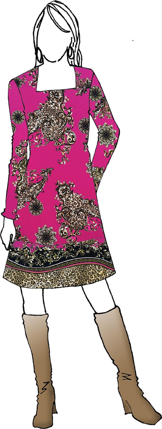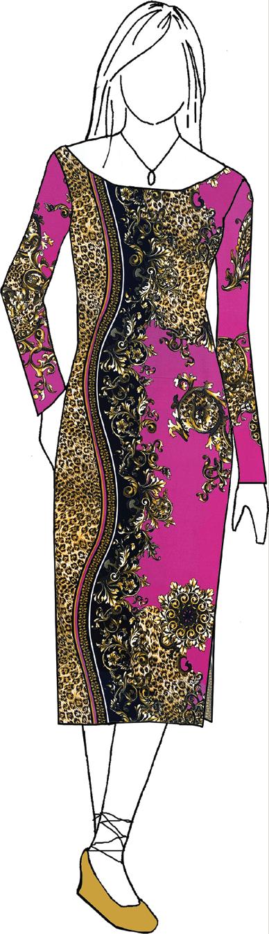 Speaking of Italian design, Bevvy Gianni reminds us of the bold Versace designs incorporating antique gold Baroque scrolls with animal prints. Choose this double border ITY knit when you want to stun guests with a bodycon dress. Fashion designer Julian Chang shows this print on his site as a tuniclength dress, using the border as a stitched-on addition - the tunic is priced at $195. He also shows it in blue as a sexy bodysuit (we have the blue, too). Have some fun!