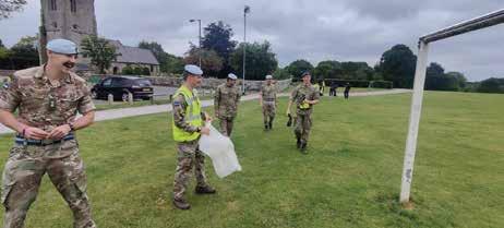 After celebrating their start on 705 Naval Air Squadron and 660 Squadron, the basic rotary training squadrons, volunteers gathered themselves and donned hi-vis equipment to descend upon Shawbury football ground. Much to the amusement of local dog walkers and park goers, the team formed an extended line and conducted a full litter sweep of the area. From sweet wrappers to cigarette butts, plastic balloons to water bottles, several refuse bags were filled and disposed of back
