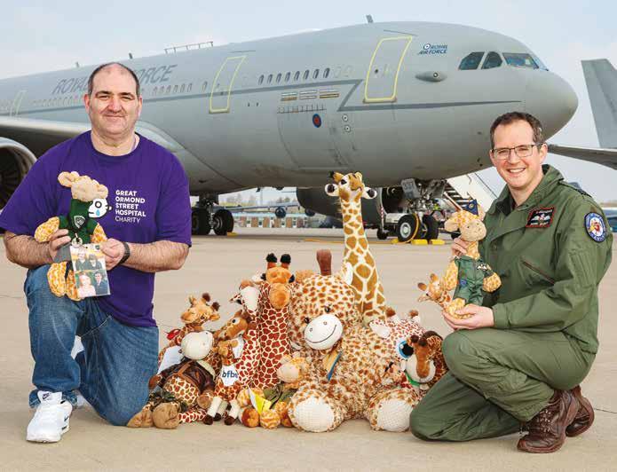 Voyager pilot Flight Lieutenant Mark Scott organised the flight and flew the giraffes. He said: “The idea came to me when I saw Giraffes on Tour in the news. My daughter also has a toy giraffe who happens to have come with me on a few trips around the world, so I got in touch with Ian from Giraffes on Tour and pitched him the idea to fill an RAF Voyager, all 291 seats with sponsored giraffes to raise money for the charity. Today we took the giraffes on an airto-air refuelling sortie, which we regularly fly in support of the RAF’s fast jet force. We had Typhoons and F-35s joining us in formation as receiver aircraft, all observed by the giraffes. For anyone tracking the flight they will have seen that we also drew a heart in the sky around the area where we were operating as a symbol of what we were doing. The whole flight went as planned and I’ve been thrilled to bits with how it went.”