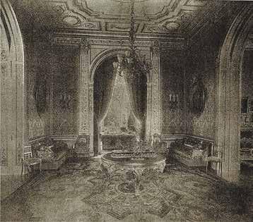 matching ceilings were decorated with gold figures, which it is believed were of 18th century French lovers, with Alfred’s initials in the corners, in gold of course.