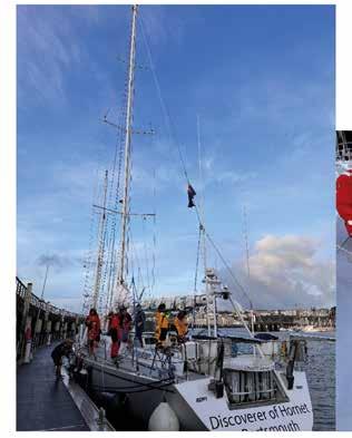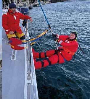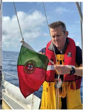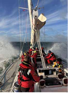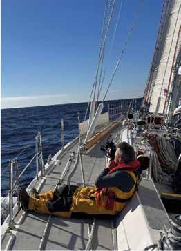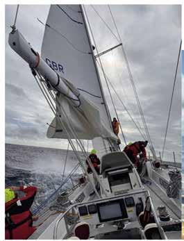 or at the helm looking at the horizon. Any movement in between these two stations induced further bouts, and the novices became quickly adept at stripping or donning life jackets and ‘foulies’ with minimal delay on the short journey between the two locations. With the increased distance to cover, the Iron Sail remained alive in order to force progress South. After nearly a full 24 hours I began to feel a little better and able to contribute more meaningfully to the watch, who not for a single moment complained about my absence or uselessness that I had so far demonstrated. This grace and kindness among the crew would become a theme during our passage, demonstrating the very best of humanity during adversity. By the evening the wind had backed enough to hoist the foresails and maintain a course to windward. The experienced crew members used VMG to ensure the optimum balance of speed and heading, while the novices just tried to keep a steady compass course while helming. The candidates for YMO began reducing sights with the sextant, which became as ubiquitous at their eyes as their sunglasses from this point onwards. In lieu of a working log, we played around with throwing stale muffins off the bow in an attempt to MacGyver a Dutch Log.