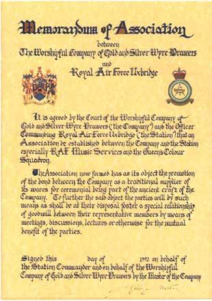 On 9th November 2022, almost 30 years to the day after the original signing, Brian Turner, Master of the Worshipful Company of Gold and Silver Wyre Drawers, re-presented a framed copy of the Memorandum of Association to Group Captain Toria McPhaden, Station Commander of RAF Northolt. This is now displayed in the Officers’ Mess alongside a similar document from the Worshipful Company of Fletchers, with whom RAF Northolt have an affiliation. Copies were also presented to the King’s Colour Squadron and to RAF Music Services.